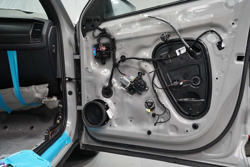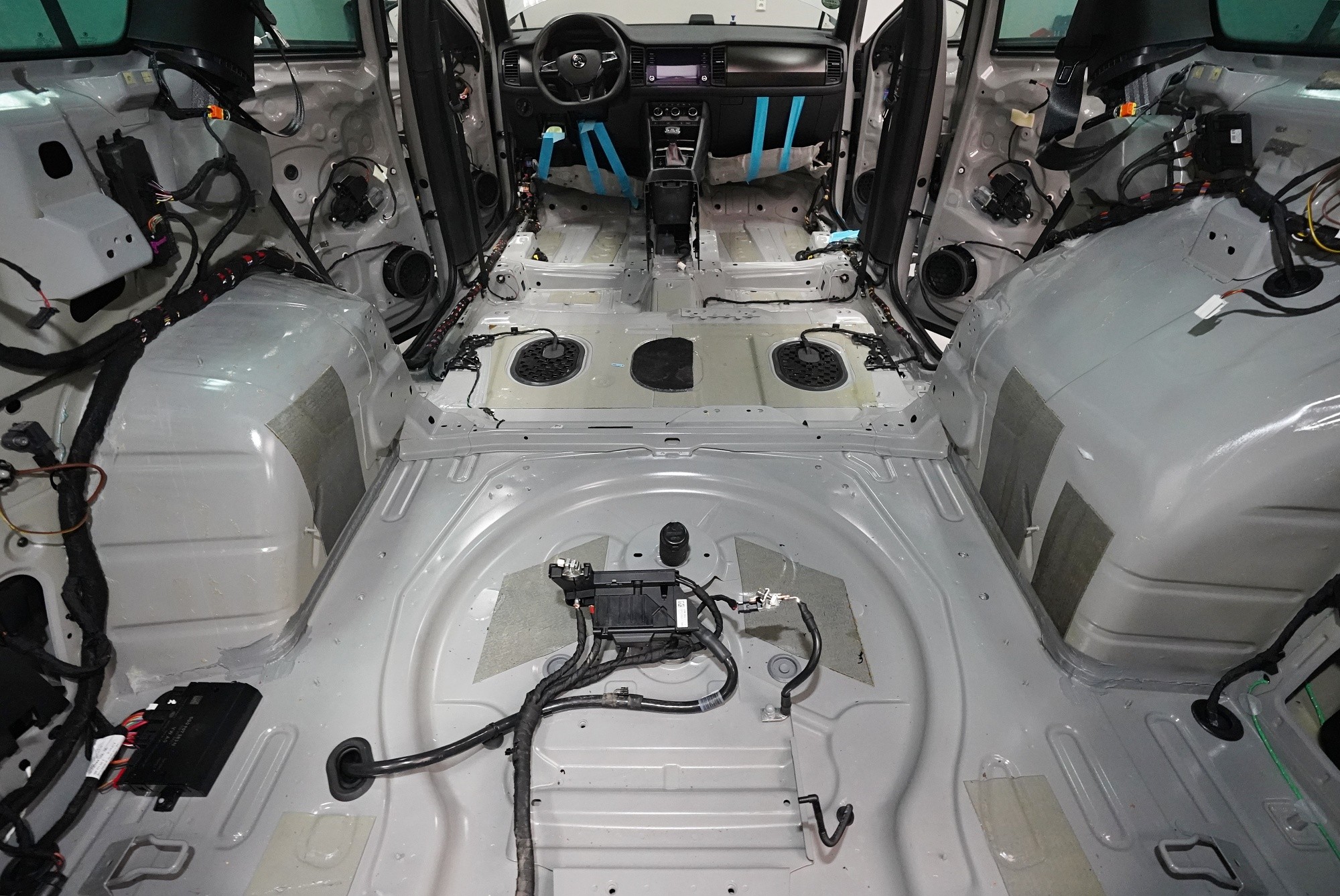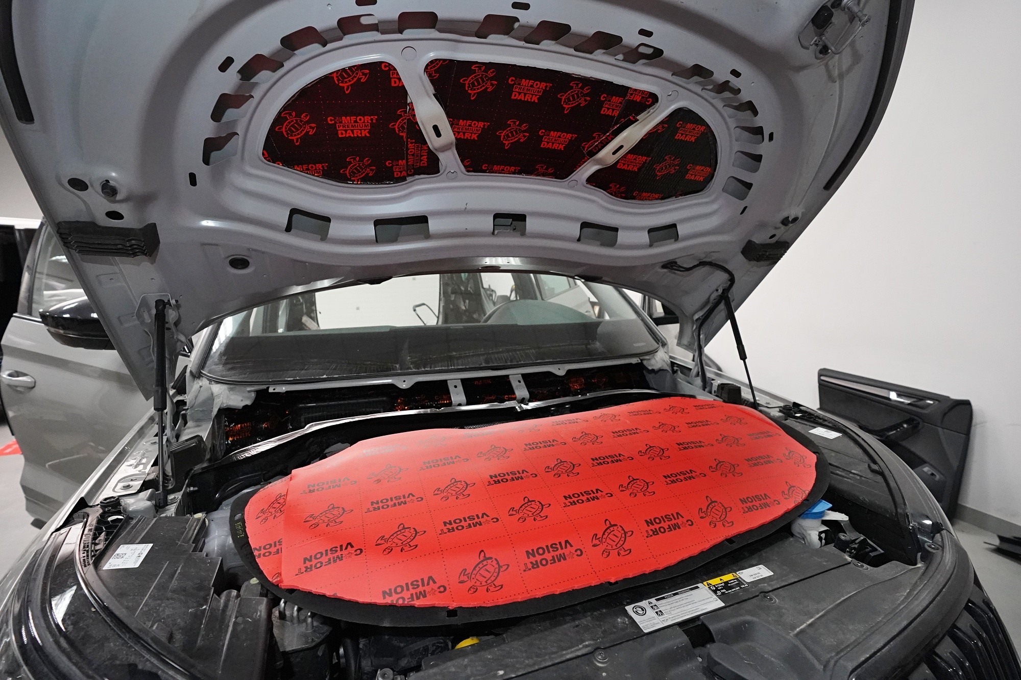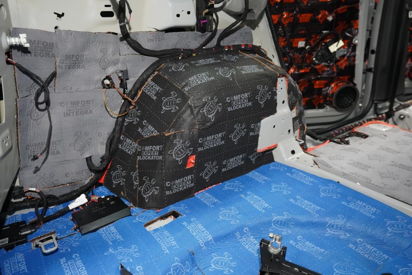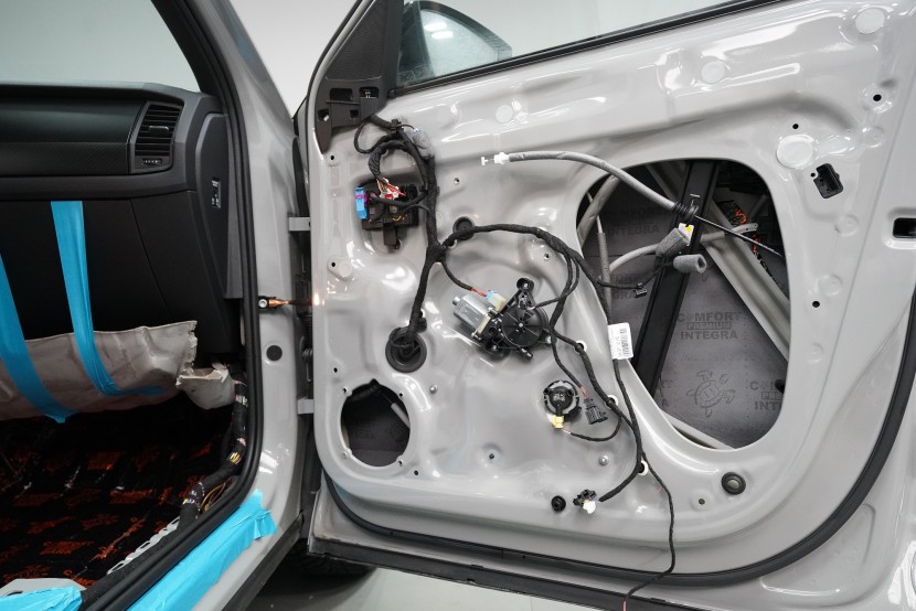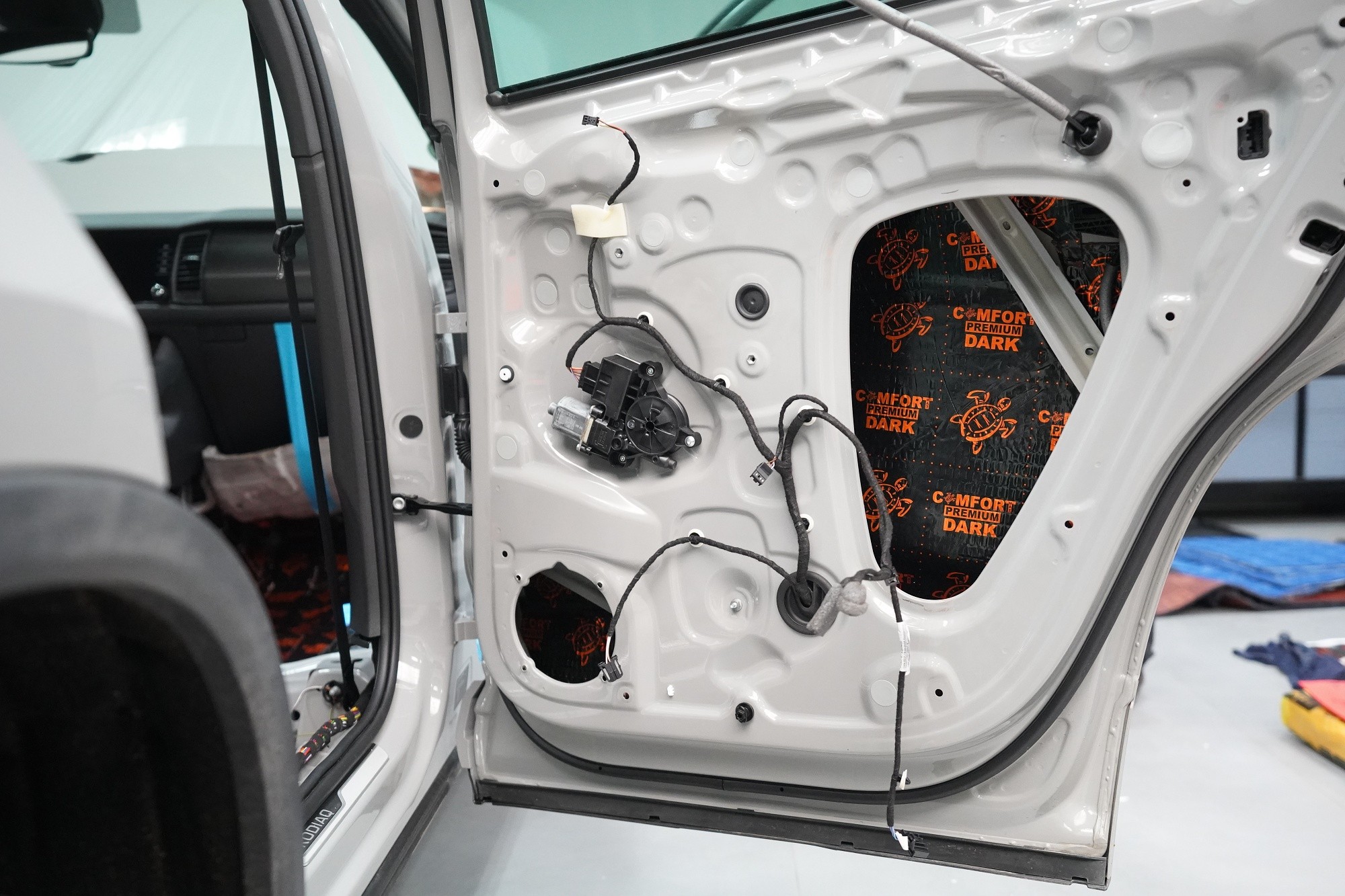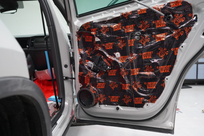 Звукоизолация на автомобил Škoda Kodiaq RS. Популярният чешки SUV е флагманът на Škoda, но фабричната звукова изолация за съжаление далеч не отговаря на това. С увеличаване на скоростта в кабината бързо нараства интензитетът на шума, и то основно от двигателя, скоростната кутия, през пода от пътя и вероятно най-силно традиционно от предните и задните колела. Нашата задача е да направим от тази красавица качествено различен автомобил по отношение на шумоизолация, така че собственика да може да се наслаждава на по-тихо и по-комфортно пътуване. Съгласихме се със собственика на пакет шумоизолация Premium Plus. В сравнение с класическия пакет Premium избираме по-ефективни и по-дебели материали и повече слоеве, като се фокусираме основно върху пода и задните калници на автомобила. Конкретно шумоизираме предни, задни и пета врата, пода, багажното пространство, задните калници и капака. Извън пакета шумоизолирахме и таблото за намаляване на шума от двигателя. Тъй като всички материали Comfortmat са и термоизолационни, този автомобил вече е защитен от топлинни загуби и термоизолационните свойства ще оцените не само през зимата, но и през лятото. По шумоизолацията работят едновременно трима наши техници, които могат да монтират в рамките на 1 работен ден.
