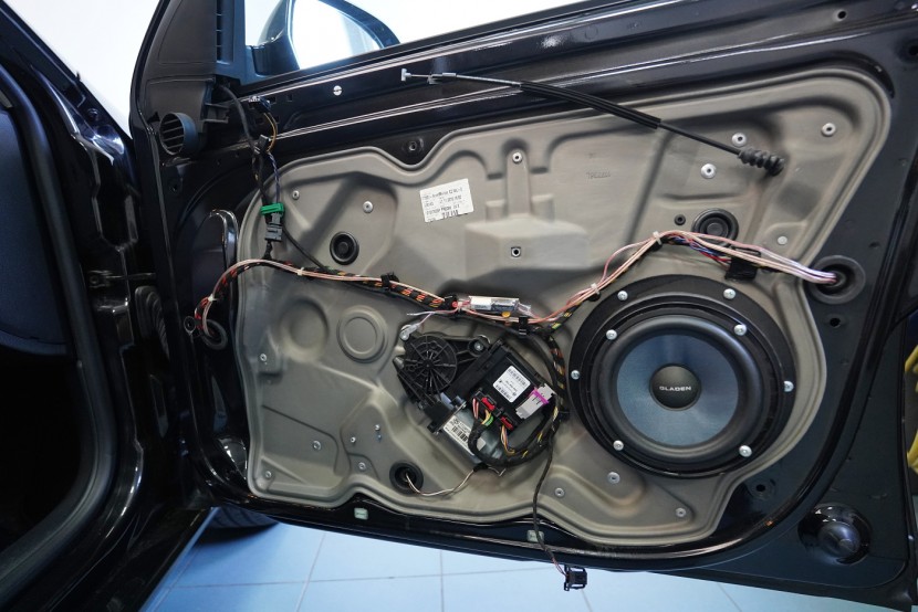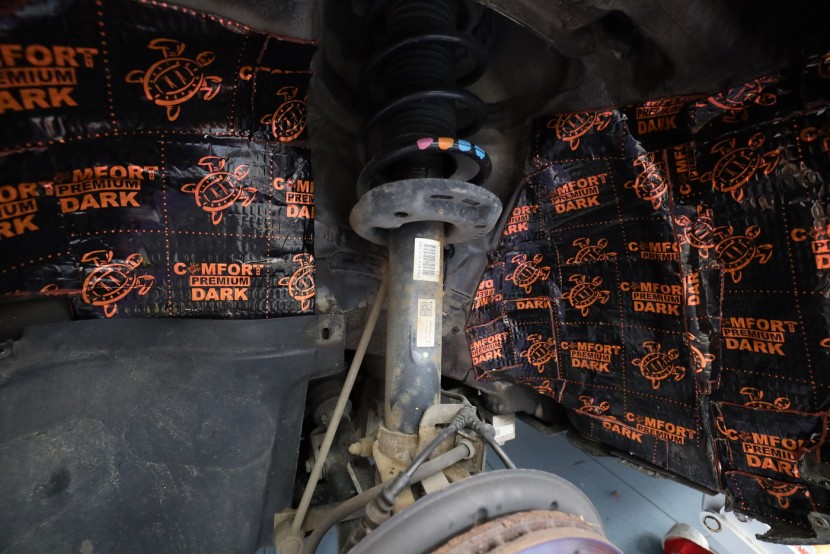 Последната зона от пакета са предните калници. Металната част шумоизолираме със силен антивибрационен материал Comfortmat D4 с дебелина 4 mm и висок ILC, а пластмасовите калници отново – с трислоен материал Comfortmat Blockshot. Въпреки че това е базовият пакет шумоизолация, благодарение на правилния избор на зони за обработка и използваните най-добри мембранни материали на вратите и калниците, успяхме значително да намалим шума, който прониква в интериора на автомобила.