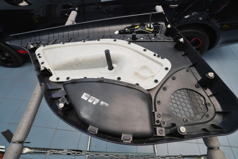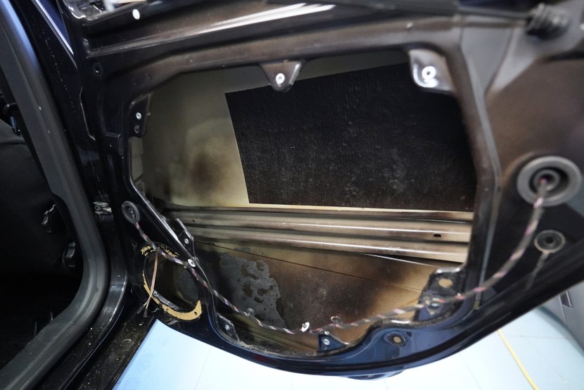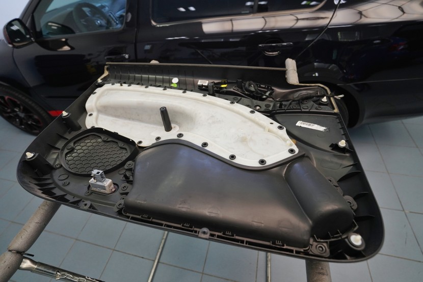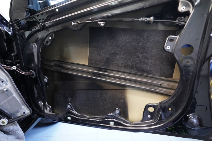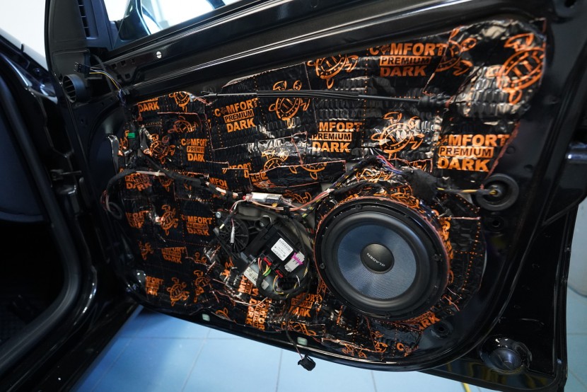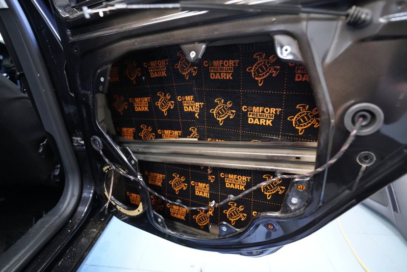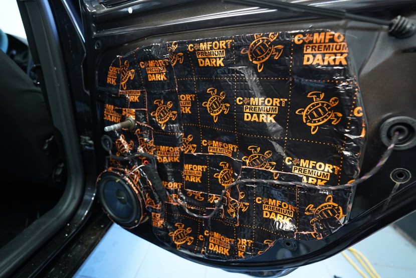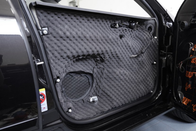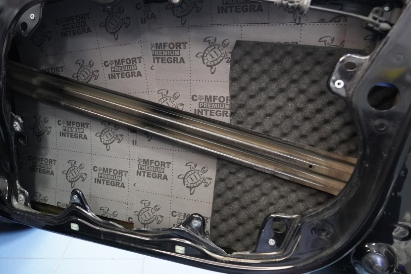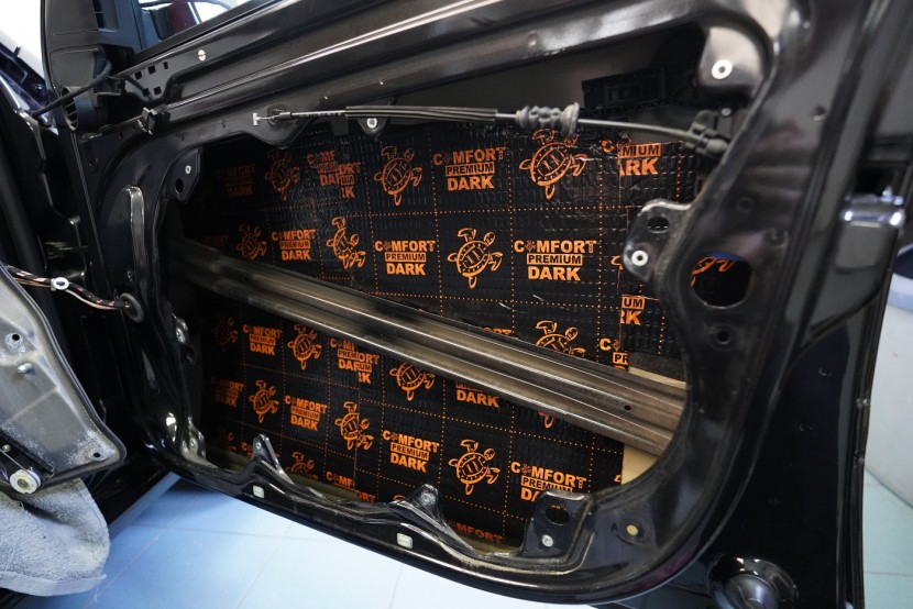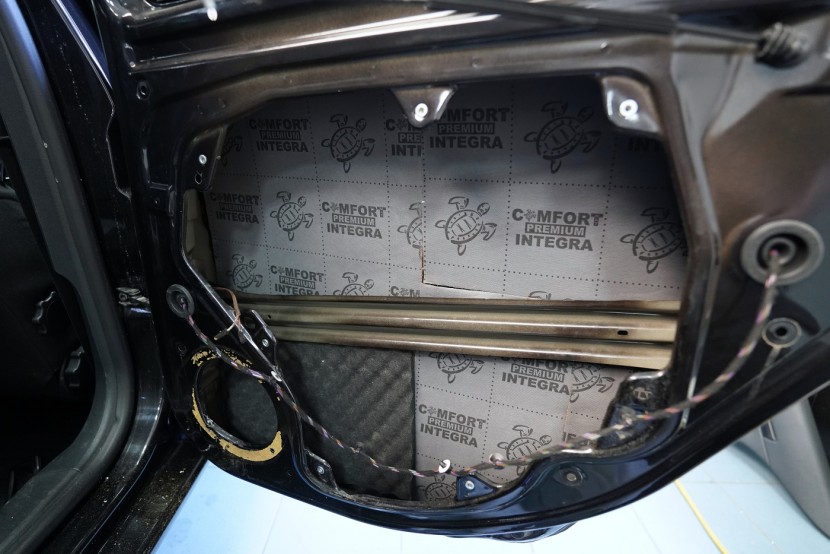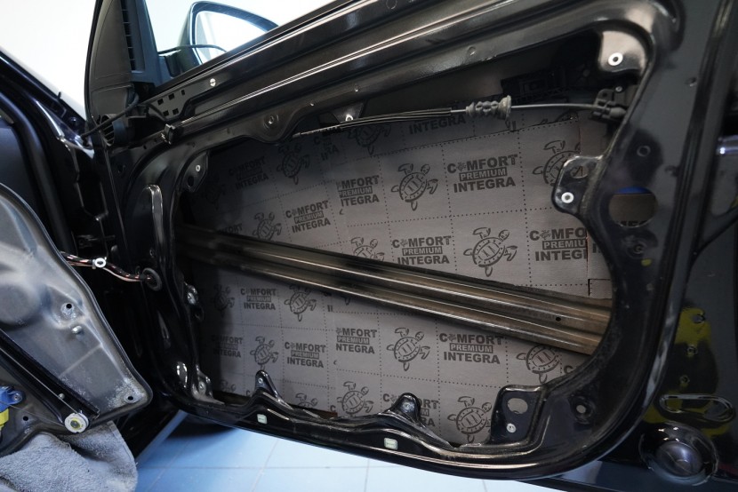 Предните и задните врати шумоизолираме в общо 4 слоя, тъй като това е зона, силно подложена на вибрации и шум. Първо върху външния лист нанасяме премиум антивибрационен материал Comfortmat D2, а след това противоп шум материал Comfortmat Integra, който е специално предназначен за вратите на автомобила. Този материал позволява благодарение на уникалната си противоп шумна мембрана безпрецедентна способност да намали шума до -28 dB и освен това има и топлоизолационни свойства. След това отново нанасяме антивибрационен материал Comfortmat D2 върху вътрешния лист на вратата. Последната стъпка е шумоизолация на тапицерията на вратата с помощта на гъвкавата формова пяна Comfortmat Soft Wave. Тя предотвратява разпространението на шум в тази зона и ще спре скърцането и дрънченето на пластмасите.