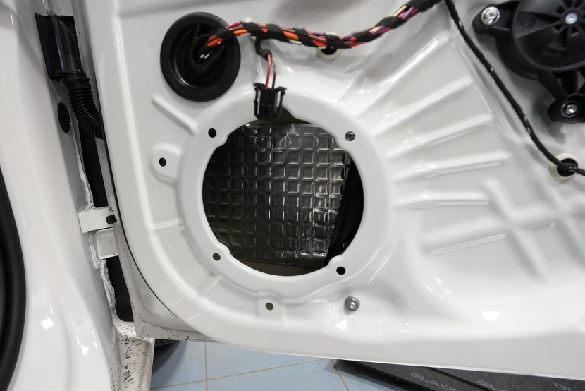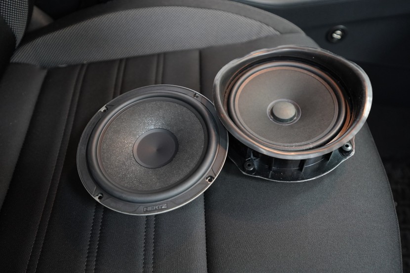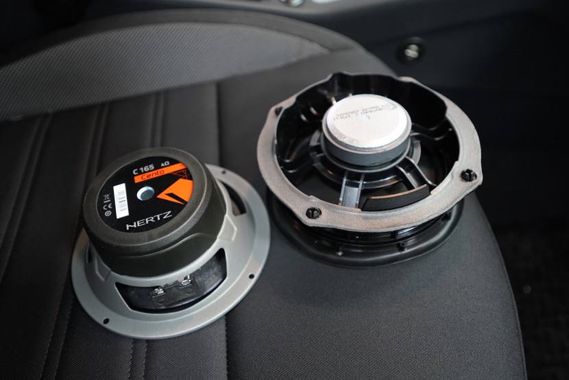 Смяна на предните високоговорители в автомобил Škoda Octavia от 3-то поколение. Избрахме нашите най-често монтирани в сервиза високоговорители Hertz CK 165, които в съответния ценови клас се отличават с много надстандартно звучене и особено с изключително висока чувствителност. Това позволява безпроблемно свързване към фабричното радио, което доставя на новите високоговорители достатъчна мощност. Високоговорителите Hertz CK 165 разполагат и с изразена басова линия, която допълнително се усилва от звукоизолацията на вратите.