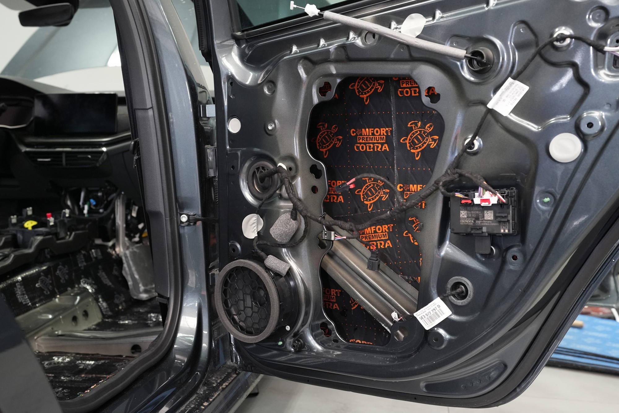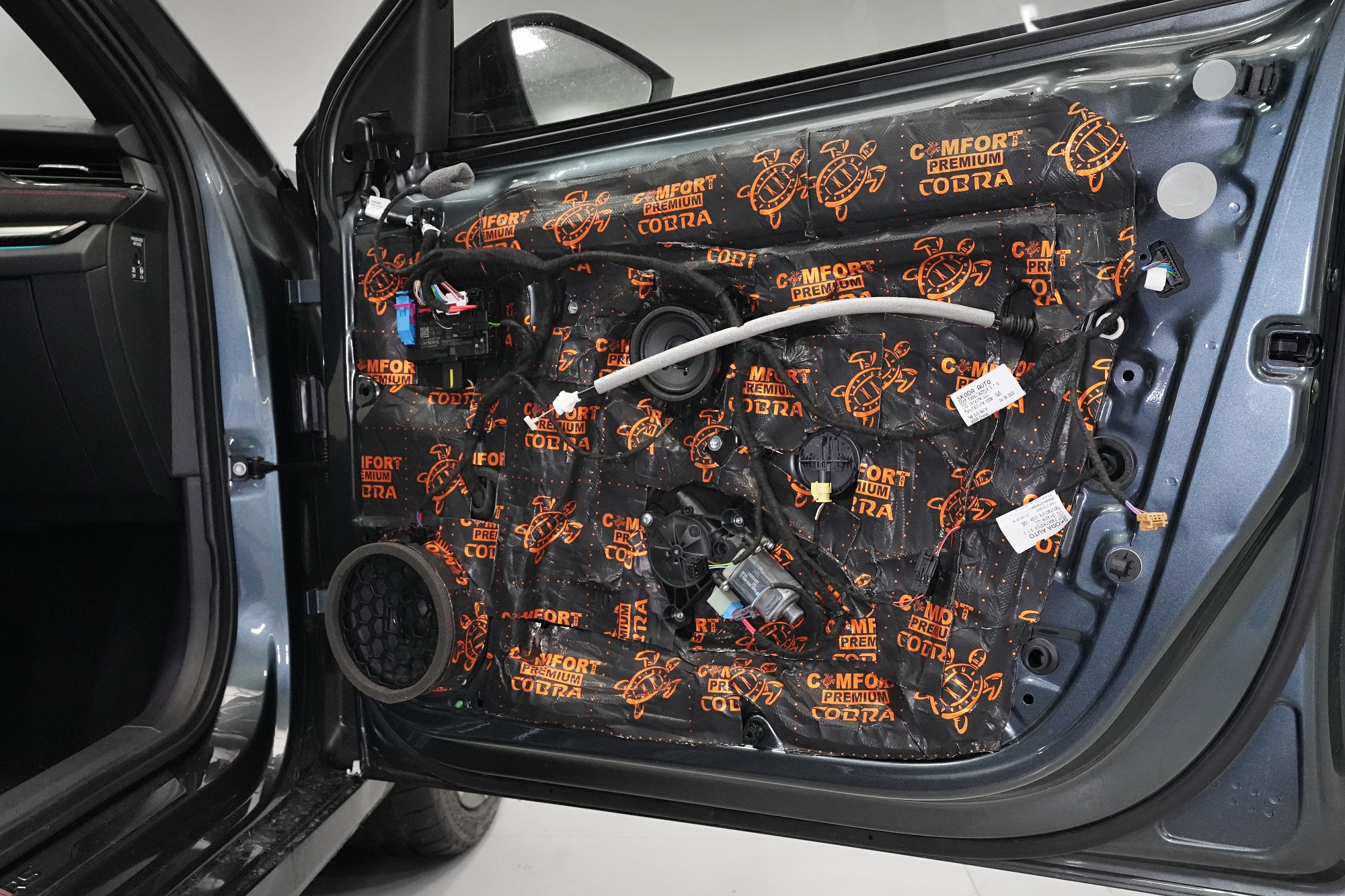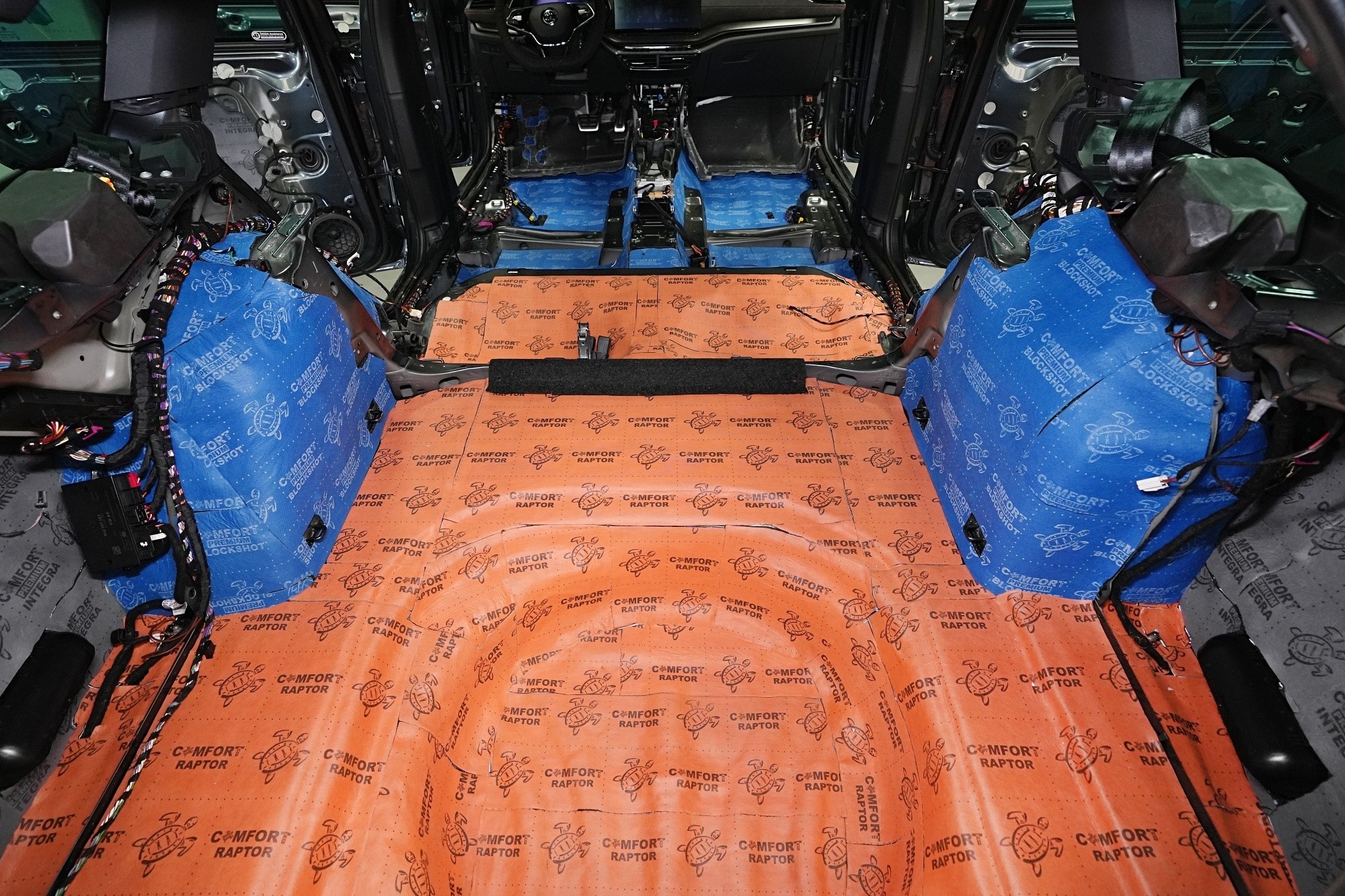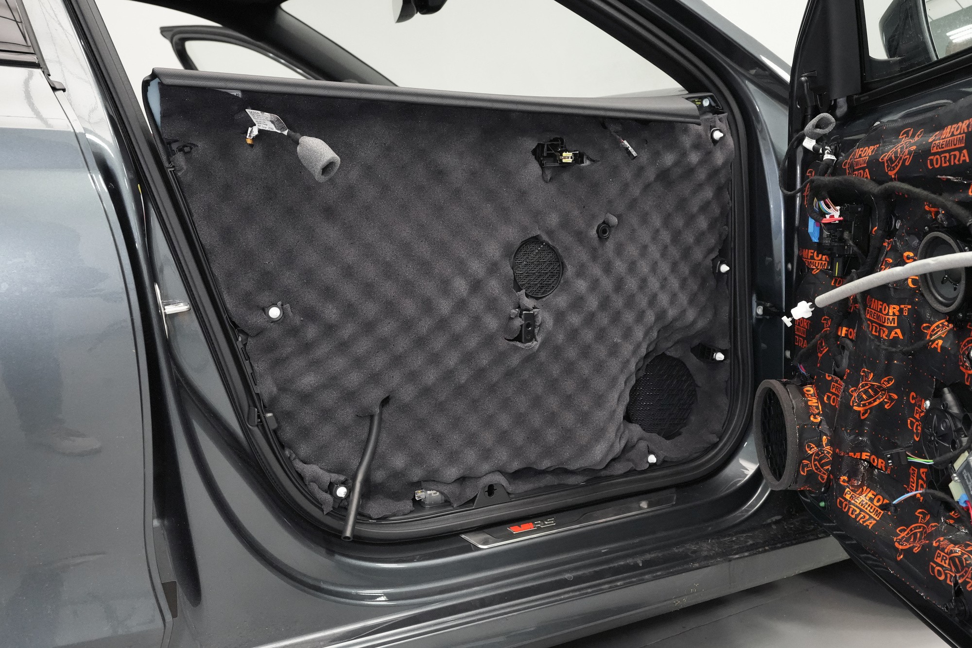 Шумоизолиране на автомобил Škoda Octavia RS четвърто поколение. В сравнение със стандартната версия RS по отношение на заводската звукова изолация не се различава. И въпреки според нас по-успешния дизайн, дори спрямо предишното трето поколение няма съществена промяна. Всичко остава както преди - каросерията липсва адекватна защита срещу вибрации и същото важи за звуковата изолация, която се намира предимно в предната част на автомобила и традиционно е част от тапицерията. За да сме честни, това състояние касае повечето автомобили, главно поради стремежа за икономии и намаляване на теглото, а оттам и емисиите. На всичко отгоре шумоизолирането е трудна и експертна дейност, която серийното производство не позволява. Но за това сме ние — да направим от тази Octavia премиум модел, поне що се отнася до звуковата изолация. Обикновено ще приложим два слоя модерни антивибрационни и мембранни материали Comfortmat, които благодарение на многослойната си конструкция и висока ефективност са в състояние да намалят шума повече от два пъти в сравнение с първоначалното състояние. Собственикът избра нашия най-популярен пакет шумоизолиране Premium, в рамките на който шумоизолирахме предните, задните и петите врати, пода, багажното пространство и предните и задните вътрешни калници. Собственикът пожела да остави капака в оригиналното му състояние, което обаче не препоръчваме на нашите клиенти. Чрез капака се предават силни вибрации от двигателя към други части на автомобила и шумоизолирането на капака може да смекчи този ефект. За инсталацията едновременно работиха трима наши опитни техници, които се справят с монтажа в рамките на 1 работен ден. Повече интересна информация за инсталацията ще намерите в нашия фоторепортаж.