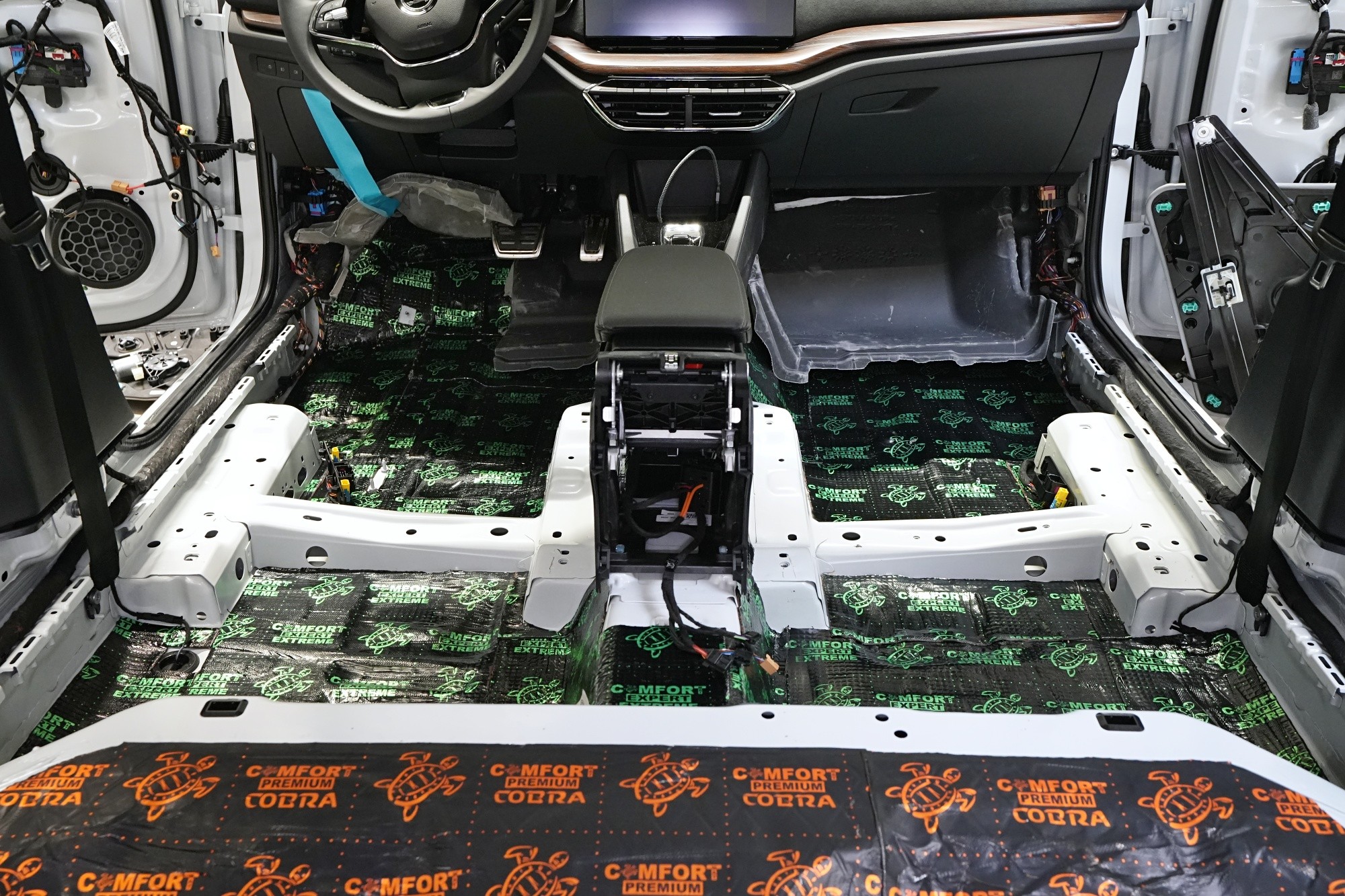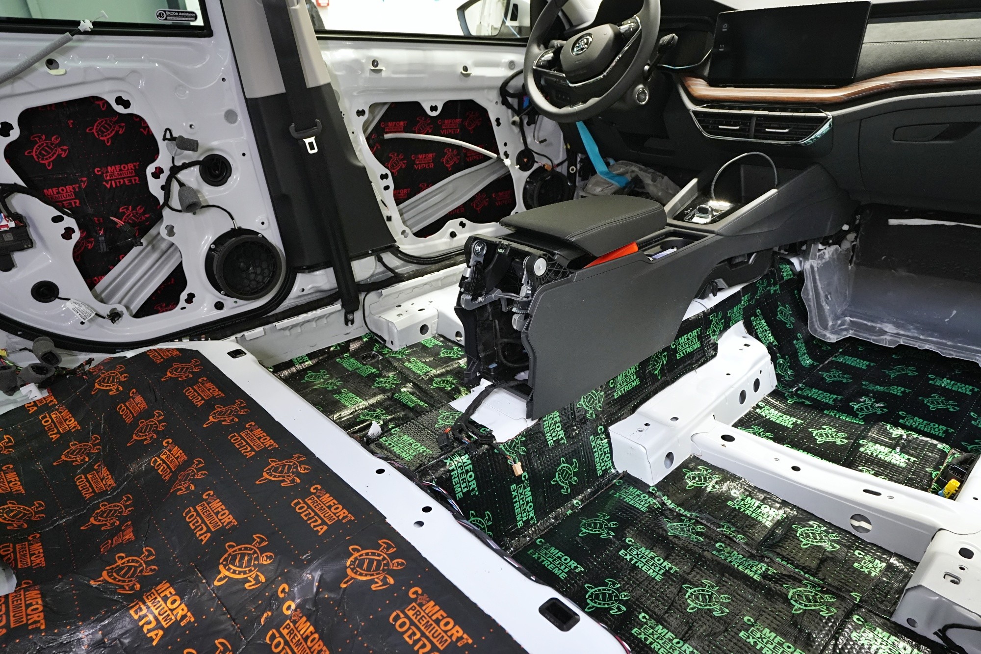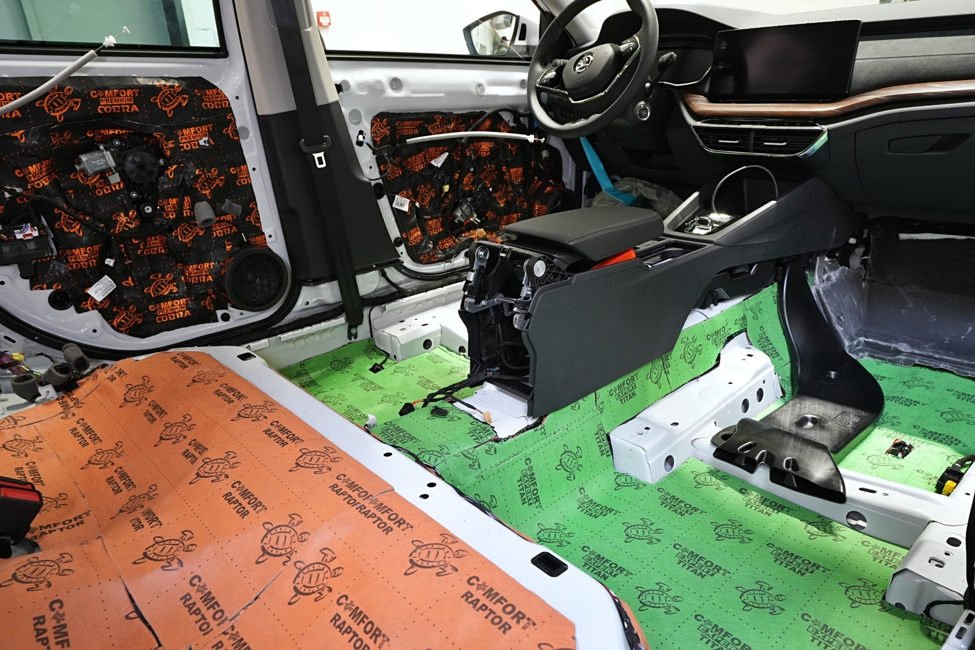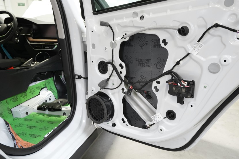 Шумоизолация на Škoda Octavia от четвърто поколение. Както при предишните модели, и „четворната октaвка“ постепенно се превръща в редовен гост в нашия сервиз. Голите метални панели на каросерията причиняват силни вибрации и шум, пренасян по въздуха, и не е чудно, че собственикът на този автомобил се обърна към нас. Правенето на автомобили тихи е нашата мисия и страст, и от тази Octavia ще направим премиум автомобил за един ден, поне що се отнася до звуковата изолация. Нашата задача е да предотвратим вибрациите и постоянното наличие на шум чрез приложение на първокласни антивибрационни и звукоизолационни материали Comfortmat в рамките на нашия пакет шумоизолация Premium Plus. Този пакет е насочен главно към шума, проникващ от предните и задни подкалници и пода, благодарение на най-ефективните материали от високата серия Comfortmat Expert. Затихихме всички ключови зони на автомобила, а именно предни, задни и пета врата, пода, багажното отделение включително задните подкалници, таблото и предните подкалници от страната на интериора. По шумоизолацията работят едновременно трима наши техници, които успяват монтажа в рамките на 1 работен ден. Повече информация можете да видите в нашия фоторепортаж.