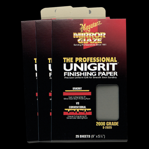 Специални шлифовъчни листове, предназначени за ръчно шлайфане на лака, така нареченото "под вода". Шлифовъчните листове Meguiar's Unigrit имат равномерна структура и осигуряват равномерно шлифоване на повърхността без дълбоки драскотини. Благодарение на това намаляват риска от нежелано пробиване на лака и благодарение на по-гладката текстура на изшлайфвания участък улесняват финалното полиране на лака. Използвайте в комбинация с подложка за ръчно шлайфане E7200 Meguiar's Hi-Tech Sanding Backing Pad.