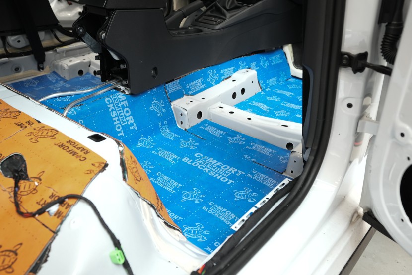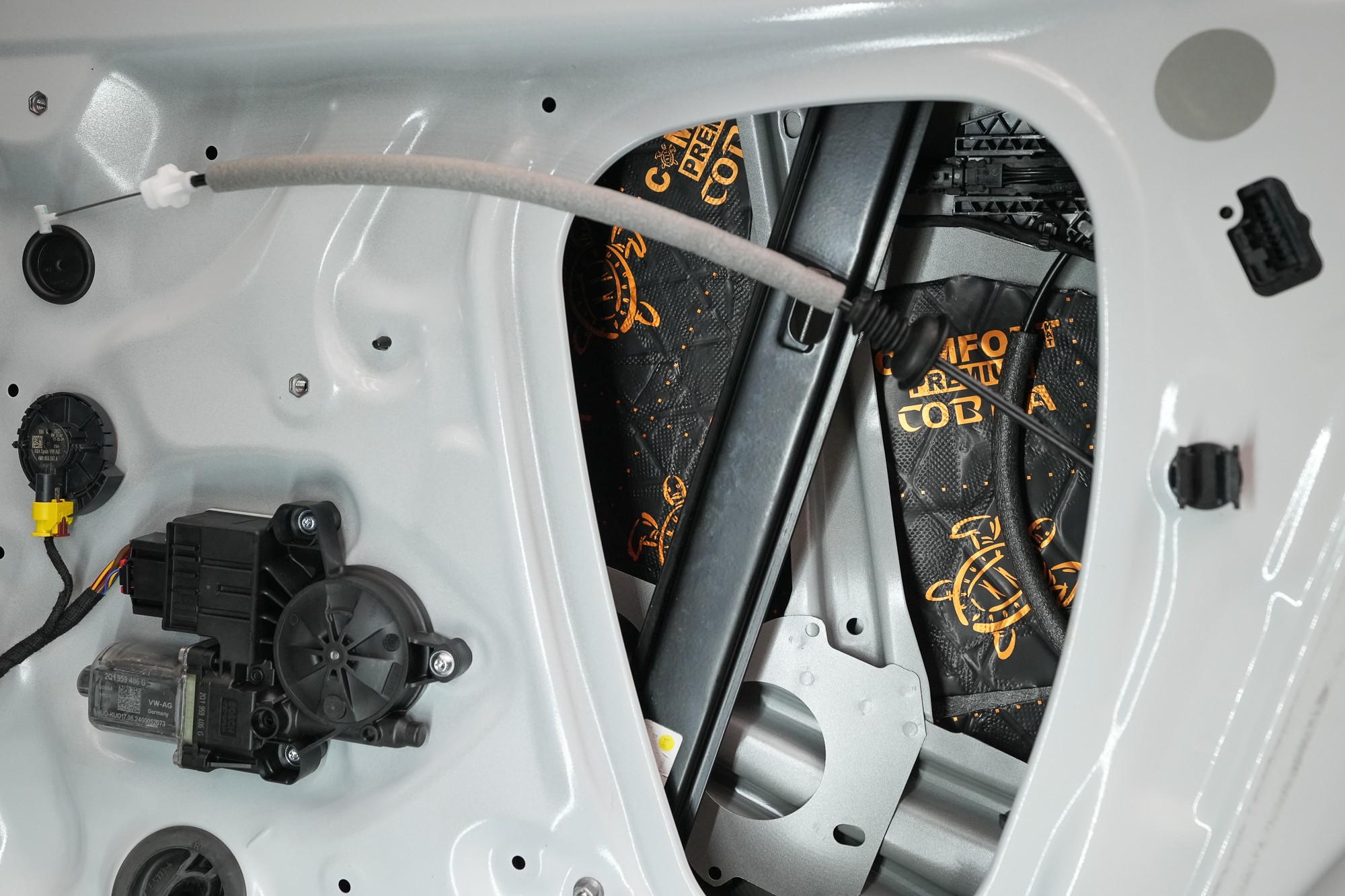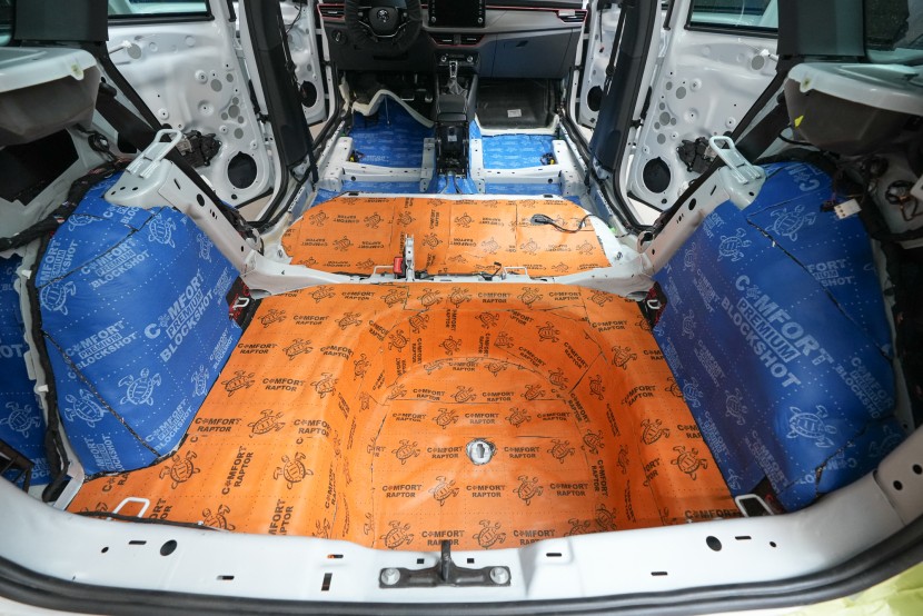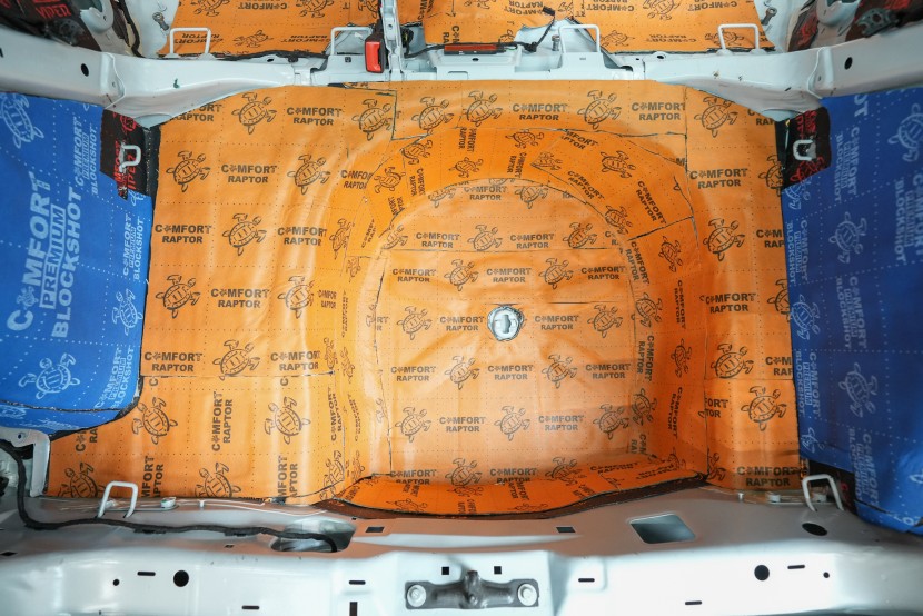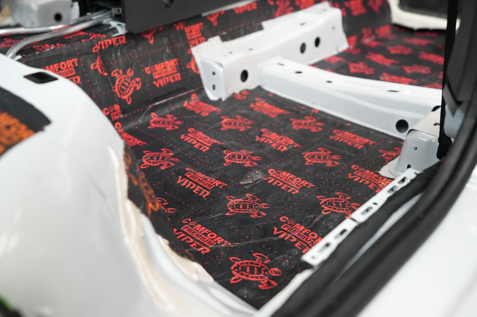 Zákazník se proto rozhodl pro kompletní odhlučnění vozu v rámci našeho balíčku Premium, který představuje zlatou střední cestu co se týče ceny, rozsahu i účinnosti. Používáme antivibrační a zvukově izolační materiály Comfortmat nejnovější generace, které spolehlivě odfiltrují vibrace karoserie, hluk přenášený vzduchem i aerodynamický hluk. Odhlučnili jsme všechny důležité oblasti jako podlahu, zavazadlový prostor, kapotu, všechny dveře a podběhy ze strany interiéru.