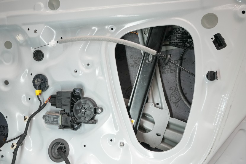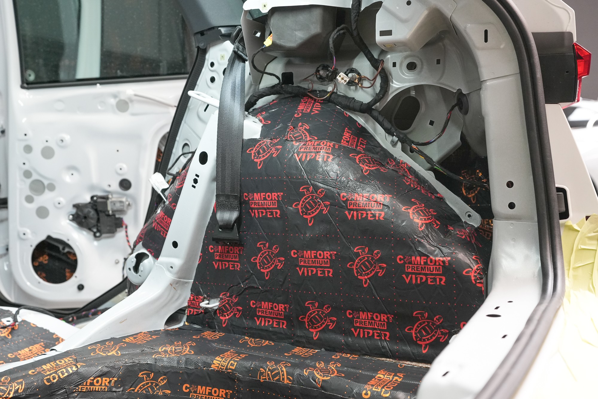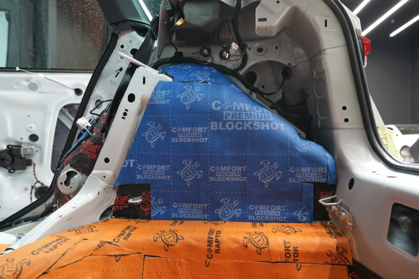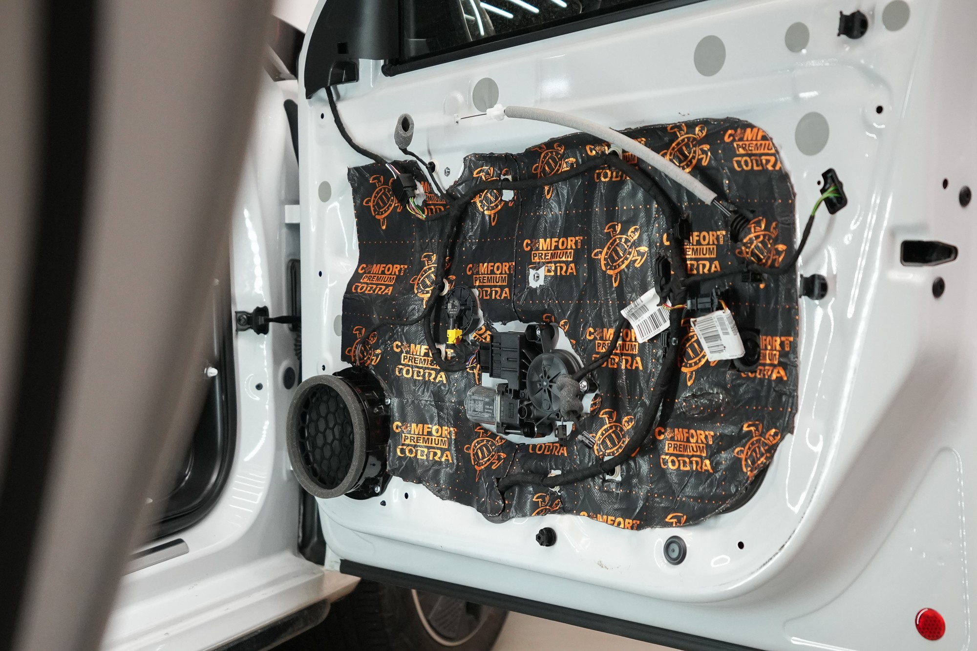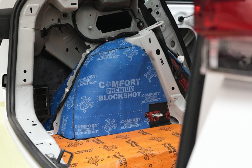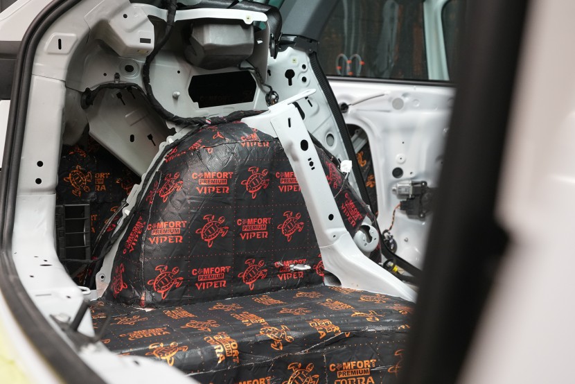 Zákazník se proto rozhodl pro kompletní odhlučnění vozu v rámci našeho balíčku Premium, který představuje zlatou střední cestu co se týče ceny, rozsahu i účinnosti. Používáme antivibrační a zvukově izolační materiály Comfortmat nejnovější generace, které spolehlivě odfiltrují vibrace karoserie, hluk přenášený vzduchem i aerodynamický hluk. Odhlučnili jsme všechny důležité oblasti jako podlahu, zavazadlový prostor, kapotu, všechny dveře a podběhy ze strany interiéru.