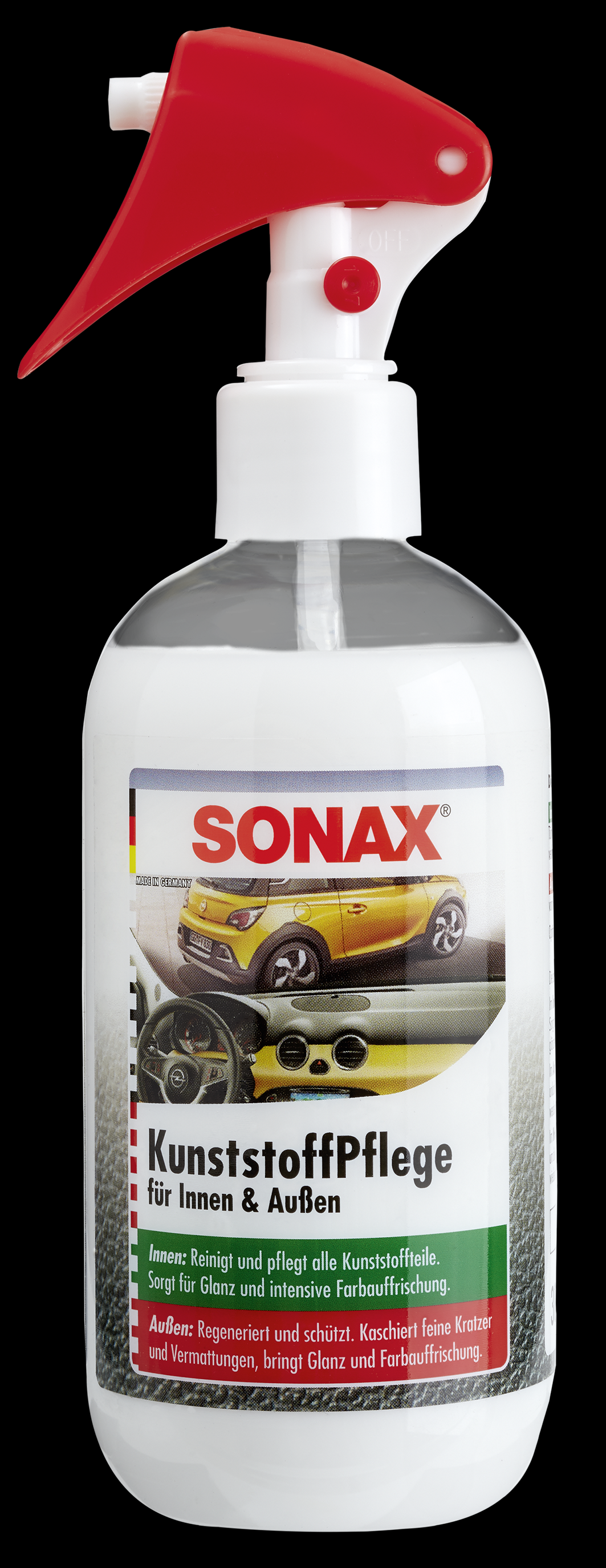 Високоефективен препарат за грижа за пластмасите на целия автомобил. В интериора почиства и поддържа всички пластмасови части (инструментално табло, облицовки на врати, пластмасови тапицерии на седалките и др.). Освежава цветовете и гарантира интензивен блясък. В екстериора почиства, поддържа и консервира всички нелакрани външни пластмасови детайли. Повърхността придобива дълбок блясък, а цветовете се възстановяват интензивно. Отстранява и матови петна и повърхностни надрасквания. Може да се използва и за консервиране на двигателя – лесна употреба непосредствено след измиване на двигателя. Не съдържа разтворители.