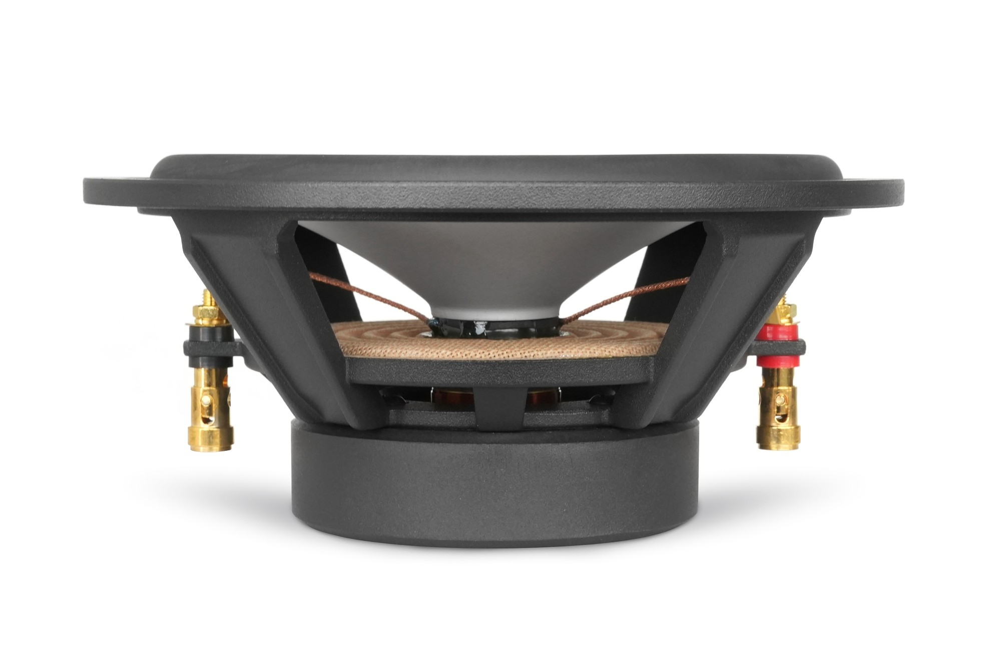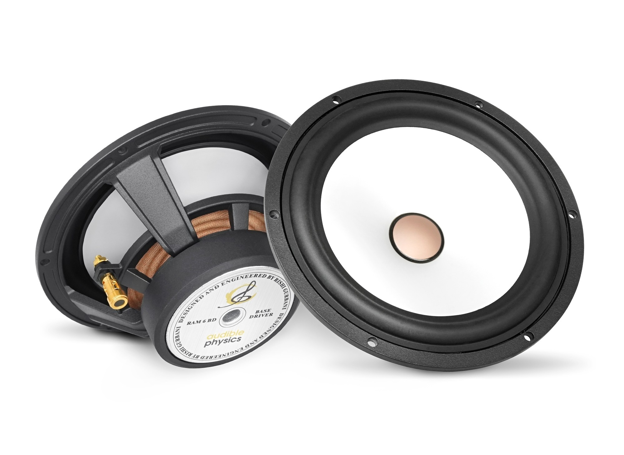 Средночестотните говорители Audible Physics RAM 6 BD са част от звуково усъвършенстваната моделна серия Studio Reference, която намира приложение не само в първокласни автомобилни системи, но и в домашни такива. Отделните компоненти от тази серия могат да се закупят в двулентов и трилентов комплект, както и поотделно. Средночестотните говорители Audible Physics RAM 6 BD се отличават с характерната бяла мембрана и купол в меден цвят. Мембраната на говорителя е изработена от патентования материал Matrix Alloy Dome от магнезиево-алуминиева сплав. Тази комбинация предлага отлична твърдост, способност за демпфиране на вибрациите и впечатляваща лекота. Това позволява възпроизвеждане на дълбоки и въздействащи баси при запазване на чисти и прецизни средни честоти. Заслужава да се отбележи и изключително равномерната честотна характеристика на средночестотния говорител, която е една от разпознаваемите черти на всички говорители Audible Physics. Здравият окачващ ръб минимизира движенията, които биха могли да доведат до контакт с 25 mm говорителна бобина и масивен феритен магнит с размери 80 x 15 mm. Специално проектираното лито шаси на говорителя е изключително твърдо, елиминира вибрациите и не се деформира толкова при движение на мембраната, както при класическите стоманени шасита. В същото време не намалява магнитното поле и значително по-ефективно отвежда топлината от говорителната бобина. На шасито привличат вниманието и масивните кабелни терминали, които обикновено виждаме по-скоро на класически субуфъри. В опаковката ще намерите дизайнерски шестоъгълни защитни решетки и, както всички продукти Audible Physics, говорителите RAM 6 BD са ръчно изработени в собствената фабрика.