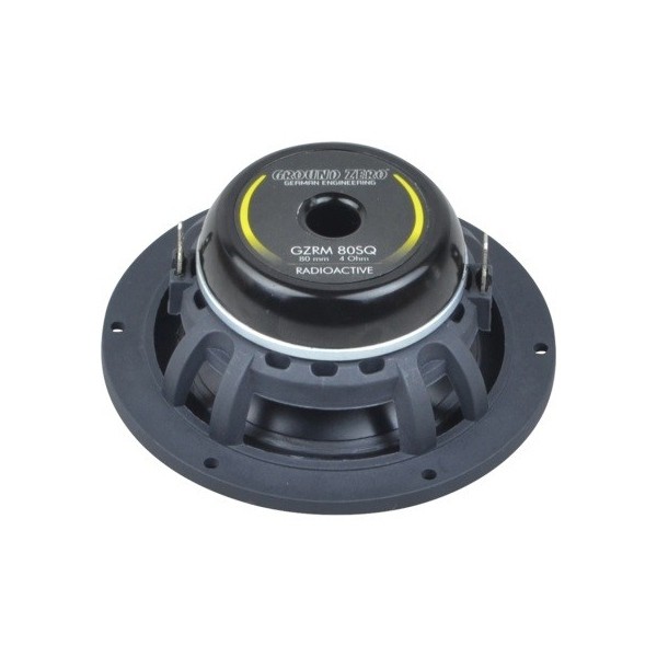 Radioactive GZRM 80SQ е 3" (8 cm) средночестотен говорител от Ground Zero. Този средночестотен говорител предлага отлично качество на звука чрез алуминиева мембрана. Оборудван е с 25 mm медна движеща бобина и неодимов магнит, което обещава отлични звукови характеристики. Съдържа здрав композитен корпус, запояеми клеми и защитна решетка.Основни характеристики на високия клас Ground Zero Radioactive