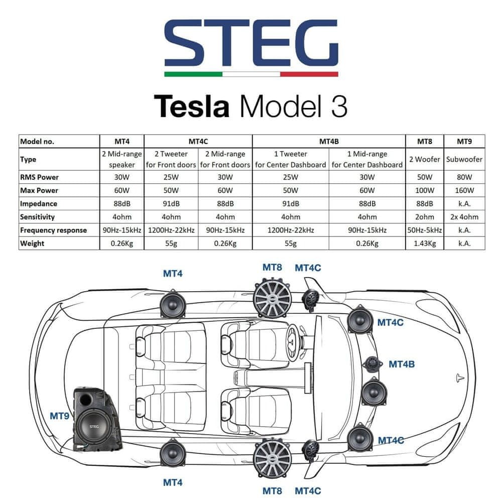 Tesla е една от най-бързо растящите автомобилни компании в момента и затова вече от сега е необходимо да се разработват и предлагат OEM-специфични говорители за нея. Като първа световна марка предлага Plug & Play говорители за автомобили Tesla именно италианската Steg. Тя предлага първокласни говорители за Tesla model 3 и model Y. С комплексна програма за ъпгрейд е единствената в света! Както личи от философията на марката STEG, всички продукти са резултат от няколко години тестове и подбор на най-добрите материали. Същото важи и за тези говорители за автомобили Tesla, в които цялото това многогодишно развитие се отразява.