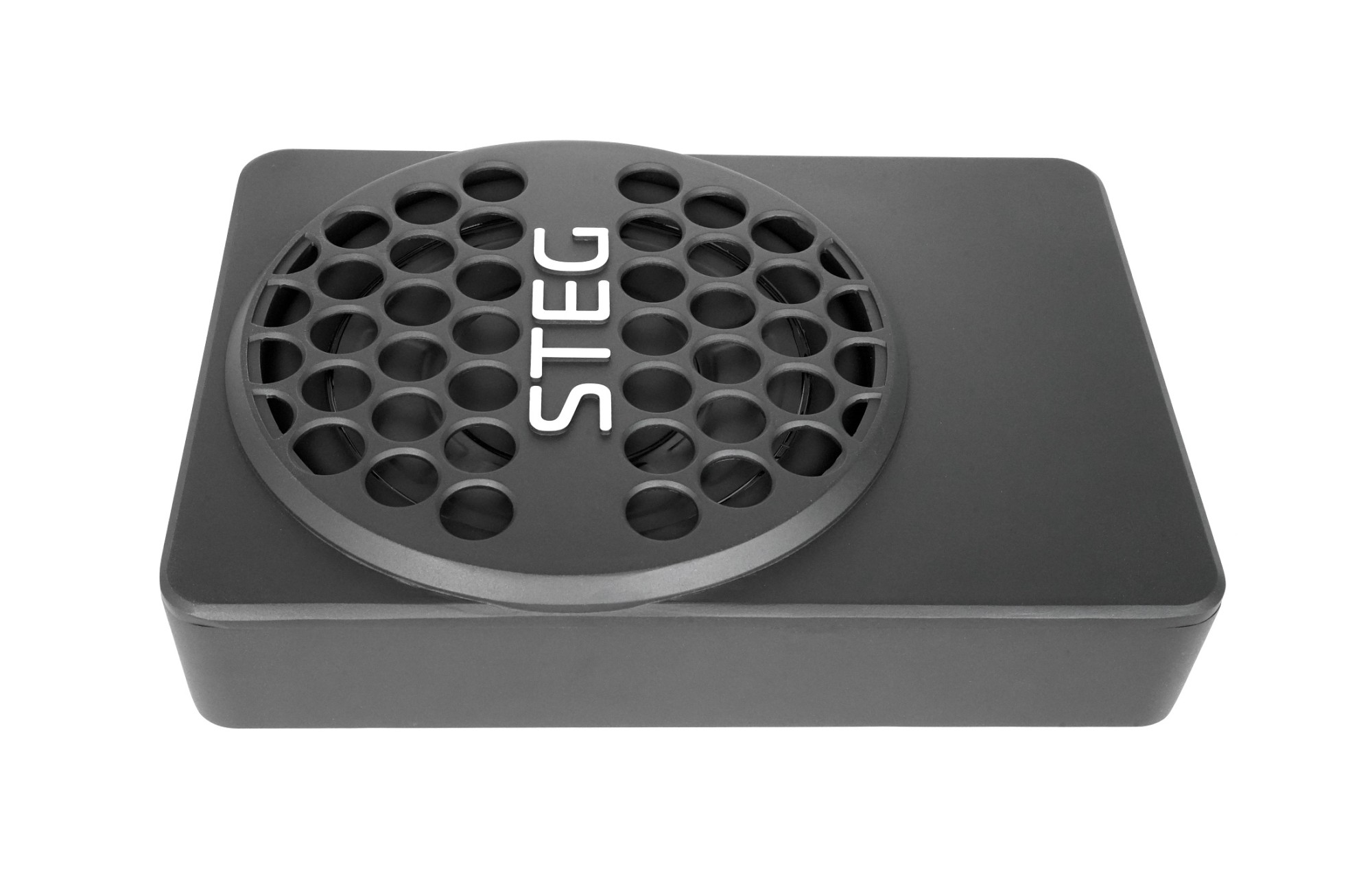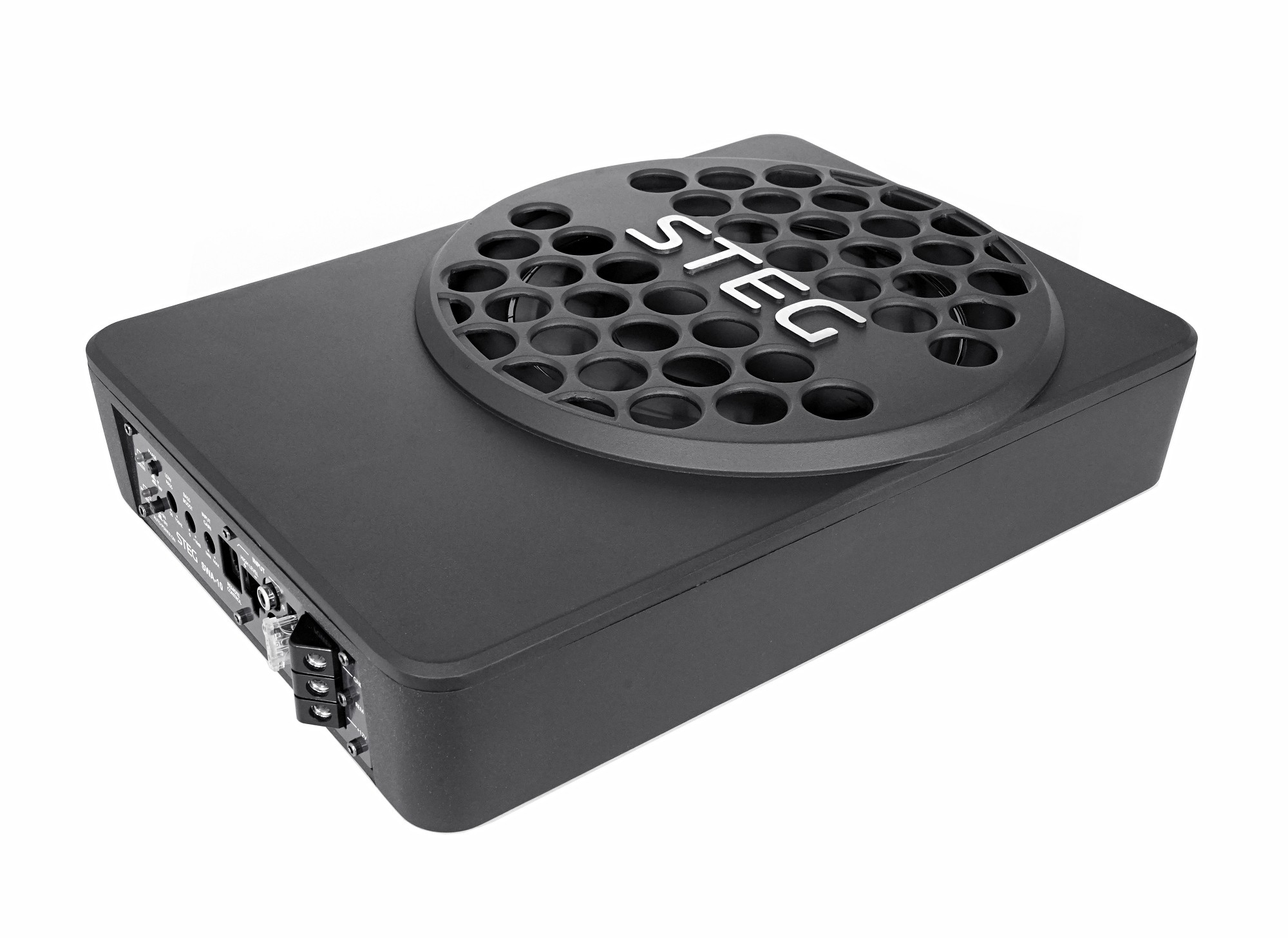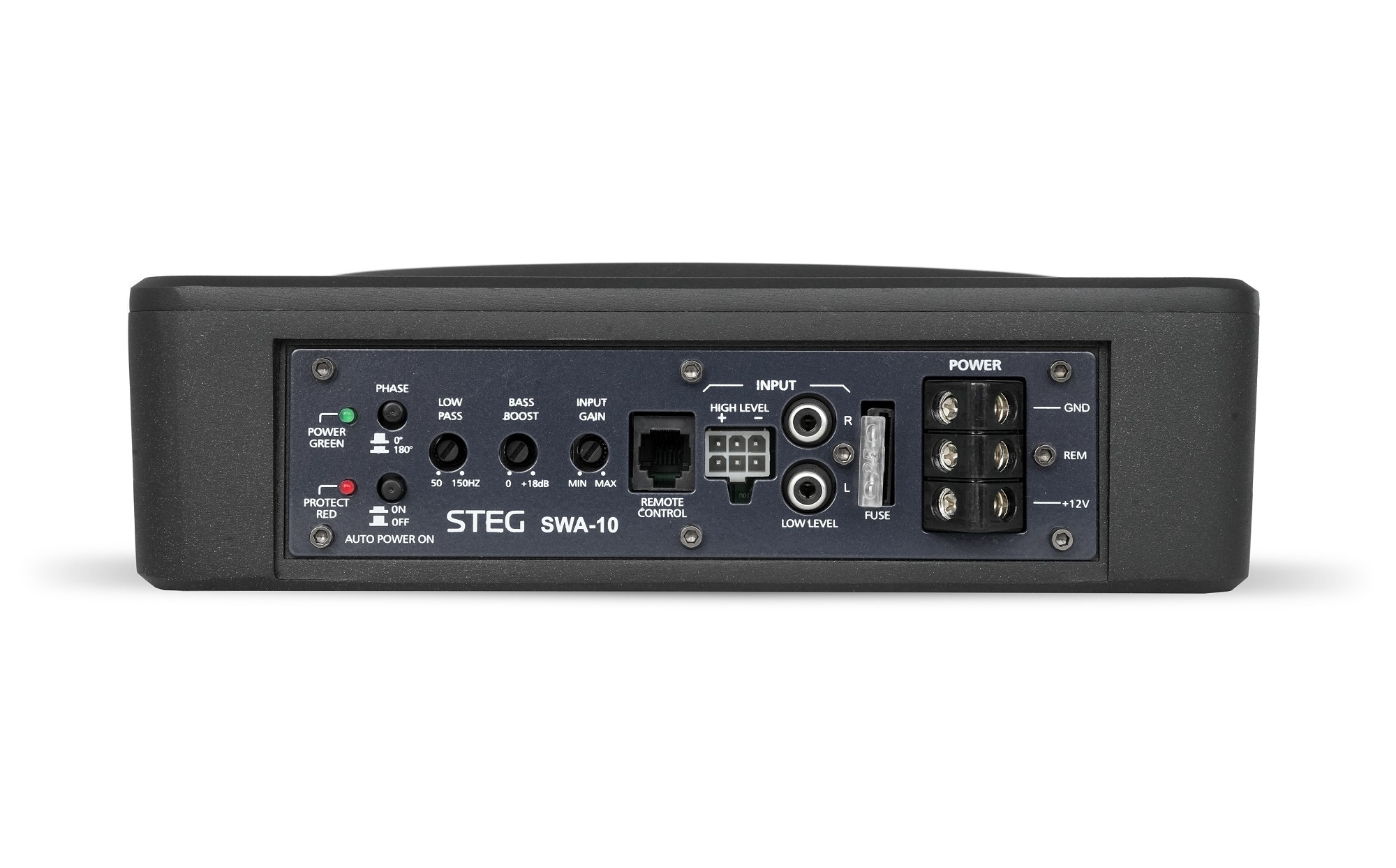 Steg SWA-10 е 10-инчов активен субуфер, подходящ за монтиране под седалката на водача или пътника. Благодарение на вградения цифров усилвател с мощност 150 W RMS субуферът осигурява висока мощност с превъзходно качество на звука, което е стандарт за този италиански производител. Субуферът притежава компактни размери, здрав алуминиев корпус и нетрадиционен дизайн. Интензивността на ниските честоти може да се регулира директно на корпуса или с дистанционно управление, включено в комплекта. Могат да се настройват и Bass Boost, Low Pass филтър и фазов сдвиг. Очаквано са налични както високонево входове, така и нисконеви (RCA) входове. Идеалното решение за всички, които искат да подсилят басовия компонент на озвучаването, без да губят практическо пространство в интериора на автомобила.