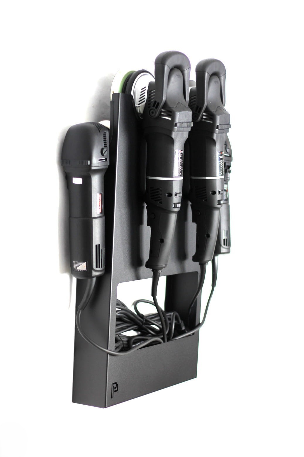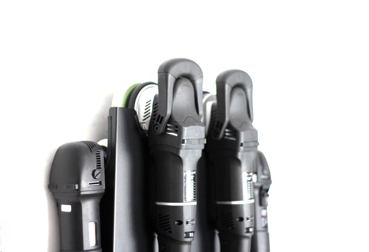 Висококачествен държач за 4 полиращи машини (2 отпред, 2 отстрани) с поставка за кабели, благодарение на което заемат много малко място. Стойката е подходяща както за DA, така и за ротационни машини с носещи дискове с диаметър 30 - 180 mm. Отворите за монтиране към стената са разположени както в горната, така и в долната част на рафта, което гарантира стабилност. Държачът е изработен от качествен метал, който е покрит с прахова боя, предпазваща от окисляване.