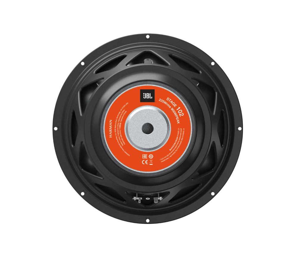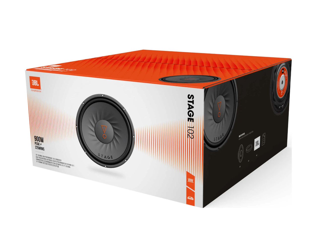 Субуферът JBL Stage 102 е достъпен и компактен 10" (250 mm) компонентен субуфер, който предлага мощни, динамични и прецизни басове с ниско изкривяване. Благодарение на по-малките си размери е идеален избор за превозни средства с ограничено пространство, като въпреки това може значително да подобри басовата част на аудио системата.