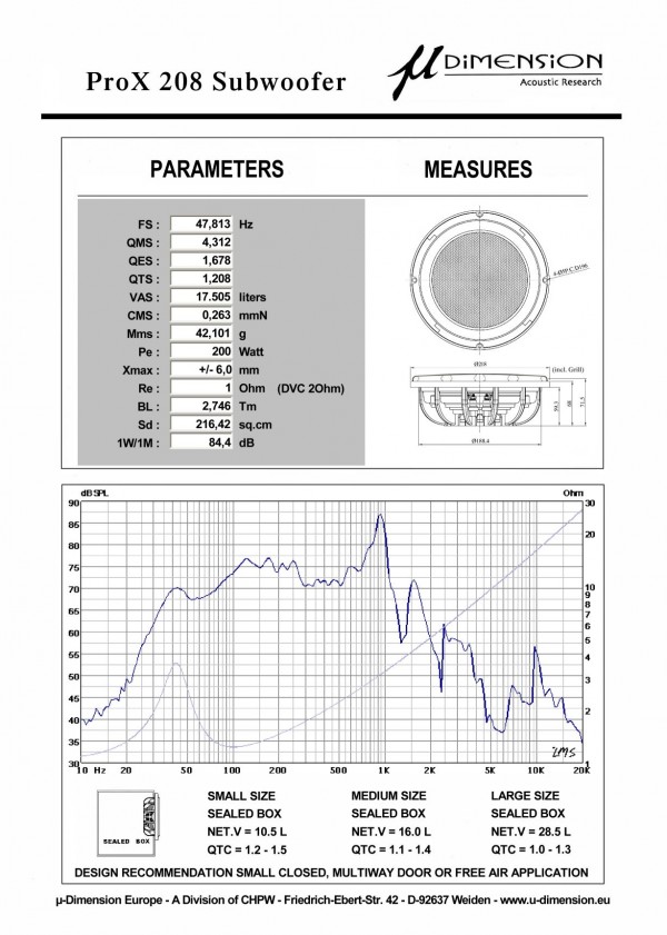 300 W RMS, 84,4 dB (1W/1m), 2 x 2 Ω, 8\"