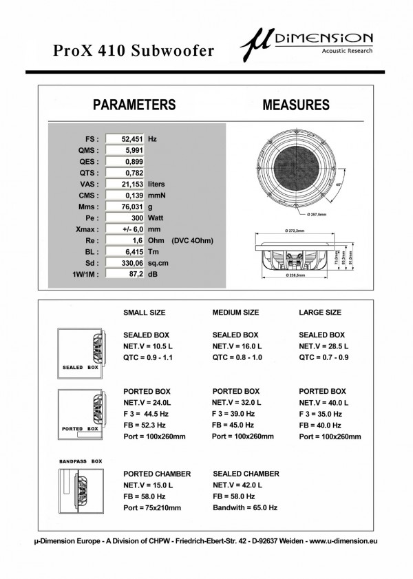 10\", 450 W RMS, 85 dB (SPL 2,83 V/1 m), 2 x 2 Ω