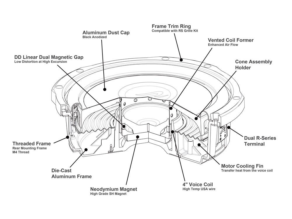 - Екстремна мощност - не се подвеждайте от размера - плитките субуфъри от серия R имат същия ход на мембраната (изместване 20 mm) като пълноразмерните субуфъри от серия R2 за екстремна мощност в плитко изпълнение. Сърцето на плитките субуфъри от серия R е свръхразмерната 4" (10 cm) говорителна бобина, управлявана от мощен неодимов магнит за мощност 600 W RMS.