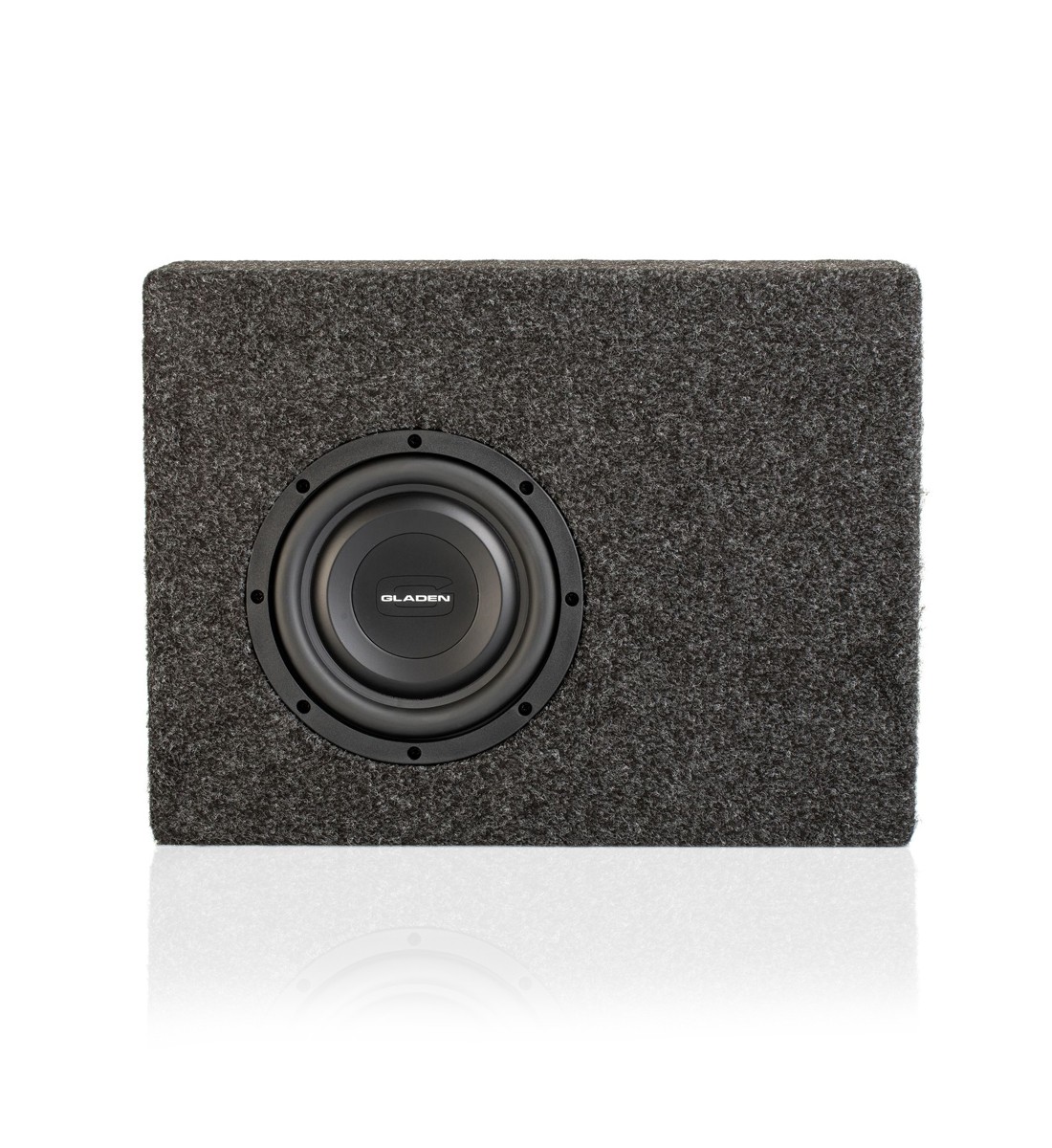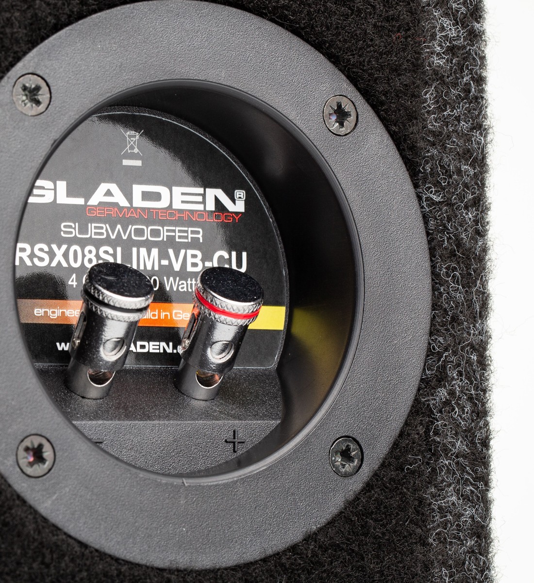 Компактните и мощни Micro RSX субуфъри от Gladen осигуряват мощна нискочестотна основа. Кутиите могат да бъдат универсално монтирани в автомобила или с помощта на приложените гумени крачета да се трансформират в downfire субуфър. Субуфърните системи Gladen предлагат широк набор от прецизно проектирани и сглобени субуфърни решения. Можете да избирате от компактни кутии с малки и плоски субуфърни говорители, които позволяват удобен монтаж във всяко пространство, както и от масивни субуфъри с високи мощности. Системите Gladen са проектирани да отговорят не само на изискванията за мощност на всеки слушател, но и на желания бюджет и наличното пространство. Всички кутии Gladen са произведени от здрави MDF плоскости, след това прецизно обработени с помощта на най-съвременна 3D фрезова технология и след това ръчно сглобени и покрити с качествен автомобилен килим. Въпреки че някои материали и компоненти се доставят от целия свят, субуфър кутиите са произведени и сглобени в Германия, за да отговарят на строги стандарти на Gladen.Основни характеристики на субуфъра в кутия Gladen RS-X 08 SLIM VB-CU