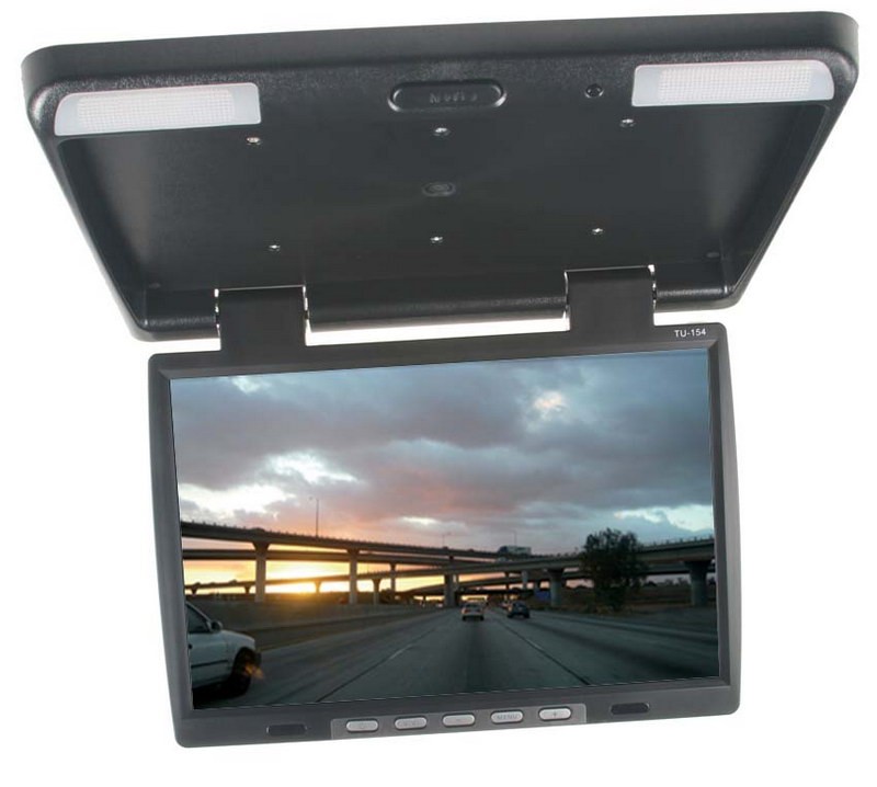 Качествен голям таванен LCD монитор 15,6\", предназначен основно за просторни леки автомобили и автобуси.
