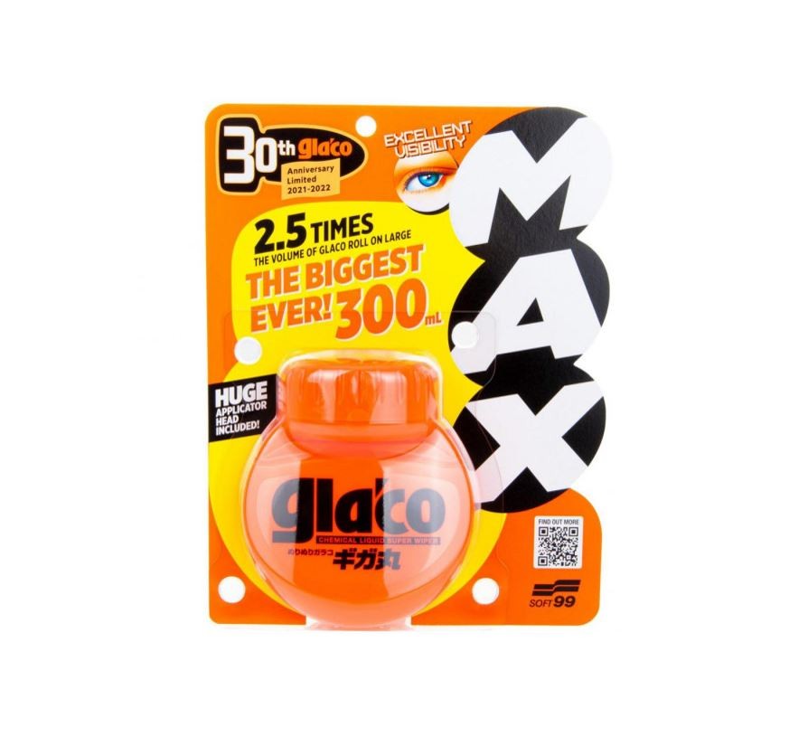 Soft99 Glaco Roll On MAX 300 ml е лимитирана серия течни чистачи за автомобилни стъкла в удобна макси опаковка от 300 ml. Glaco Roll On е идеалната опция за нанасяне на защитен покритие върху прозорците. Glaco образува невидим защитен филм на стъклата и огледалата с отличен ефект на отблъскване на вода при скорости от само 45 km/h. Glaco Roll On е отличен продукт при всякакви метеорологични условия - през зимата предотвратява заледяване на стъклата. Продължителността на ефекта е минимум 3 месеца след нанасяне. 300 ml обем, новата форма на бутилката и същите отлични свойства през повече от 30 години гарантират световното водещо място на Soft99 в областта на хидрофобните покрития за стъклени повърхности. Glaco Roll On Max е един от най-лесните начини да осигурите по-безопасно и по-комфортно шофиране в дъжд. Като създава хидрофобен филм на повърхността, позволява на водните капки да се отвяват от предното стъкло при скорости от само 45 km/h. Благодарение на това Glaco Max Roll On е идеален както за градско шофиране, така и за дълги пътувания, а дори и през зимата намалява натрупването на лед. Големият обем на лимитираната серия Max осигурява и по-голяма ефективност - до 20 приложения.