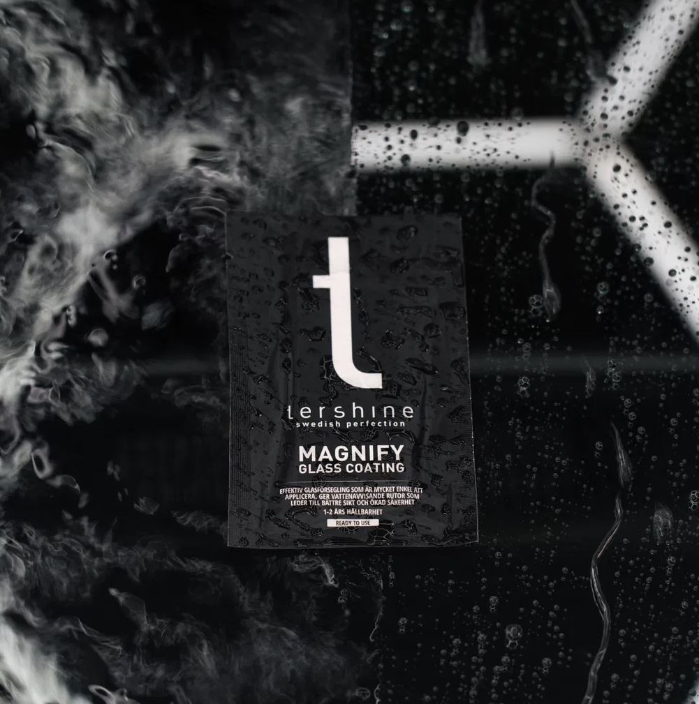 Tershine Magnify Glass Coating са много ефективни течни чистачи, които се нанасят лесно. Осигуряват висока водоотблъскваемост на стъклото, което води до по-добра видимост и повишена безопасност при шофиране. Продуктът има трайност до 2 години и стига за 3 до 6 стъкла в зависимост от размера.
