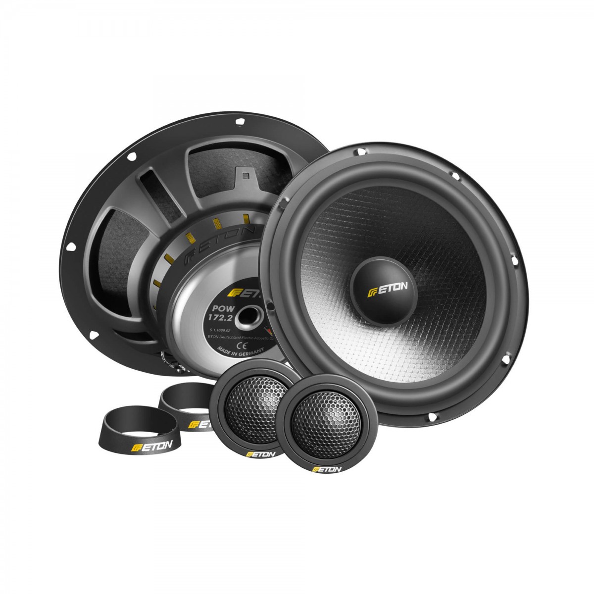 POW 172.2 отбелязва следващата глава в много успешните автомобилни говорители. Тази система блести с нов дизайн и множество прогресивни функции. Eton POW 172 (1. поколение) беше пробивна система - реалната чувствителност 89 dB позволи директно свързване към автомобилното радио (и с типичното за ETON качествено изпълнение) и тези говорители станаха пионери през 2010 г. Сега POW 172 се връща - в нов, напълно преработен вид и готов отново да стане бестселър. Визуално системата значително се е подобрила, кошът в черен сатенов завършек и гумената капачка на магнита станаха много по-привлекателни. Мембраната се състои от смес от стъкло и хартия, което гарантира напълно хармоничен звук и невероятно дълбоки баси, характерни за серията Eton POW. Като цяло POW 172.2 няма проблеми дори с възпроизвеждането на много сложна музика, където има голям брой инструменти. Новият, по-силен магнит и ново сглобеният кросоувър завършват системата и визуално. Импедансът 3 Ω на басовия говорител ще осигури по-висока мощност при свързване директно към автомобилното радио. 25 mm високочестотни говорители с алуминиево покритие могат да възпроизведат кристално чисти и убедително обемни детайли. Наследниците на POW 172 запазват силните страни на 1. поколение и добавят подобрен външен вид и производителност. Успешната история продължава...Ключови характеристики на говорителите Eton POW 172.2