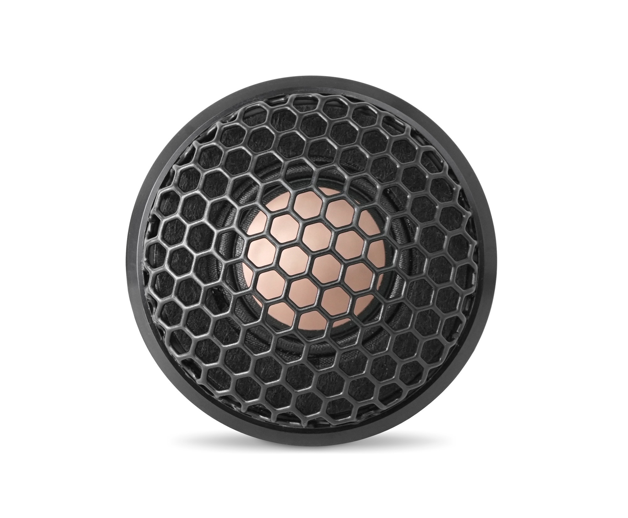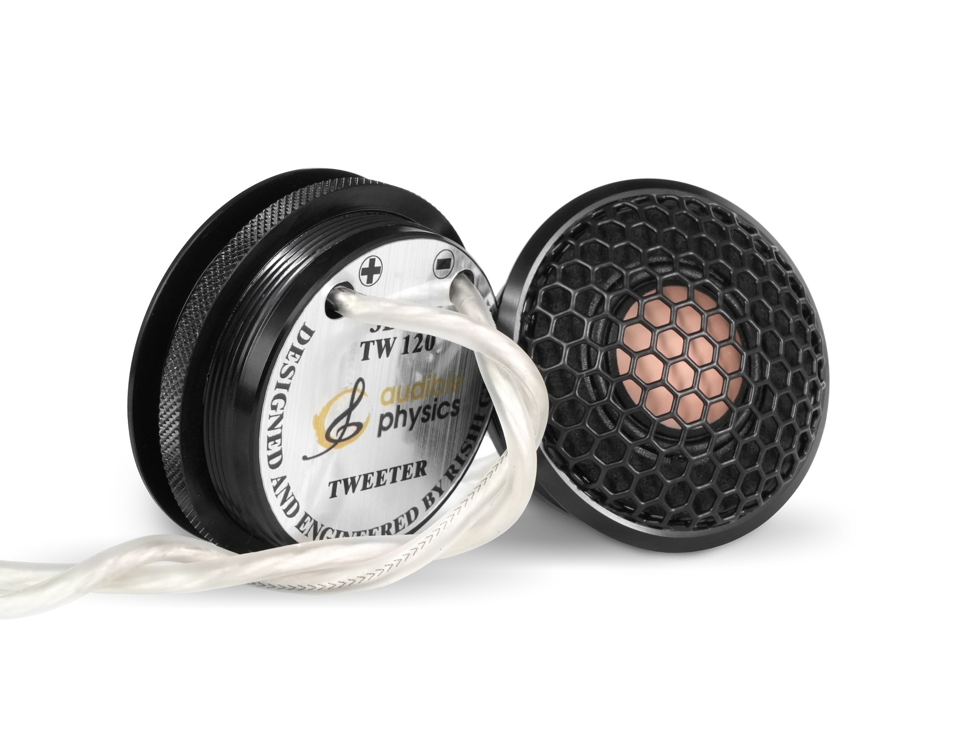 Мембраната на високочестотния говорител Audible Physics TW 120 е изработена от собствен патентован материал Matrix Alloy Dome. Това е магнезиево-алуминиева сплав, която предлага няколко предимства, сред които изключителни високочестотни детайли, аналитично прецизно звучене и изключително дълбока звукова сцена. Този сплавен купол впечатлява с перфектна линейност на честотната характеристика и почти пълна неутралност. Магнезият притежава отлични демпфиращи свойства и заедно с много твърдия алуминий в сплавта значително намаляват изкривяванията и механичната деформация. Висококачественият неодимов магнит с диаметър 19 mm е оптимизиран за по-добра ефективност и подобряване на линейността, осигурявайки перфектно управление на захранването и увеличаване на честотната лента и ефективността. Не бива да забравяме резонансната честота 960 Hz, която позволява възпроизвеждането на по-ниски честоти в сравнение с повечето конкурентни високочестотни говорители. Куполът в меден цвят визуално продължава мембраната на средночестотния говорител и така оформя перфектно съчетана система. Заслужава да се отбележат и красивите стоманени куполи на високочестотния говорител, проектирани за вграден монтаж. Те съдържат пръстени за бързо и надеждно закрепване.
