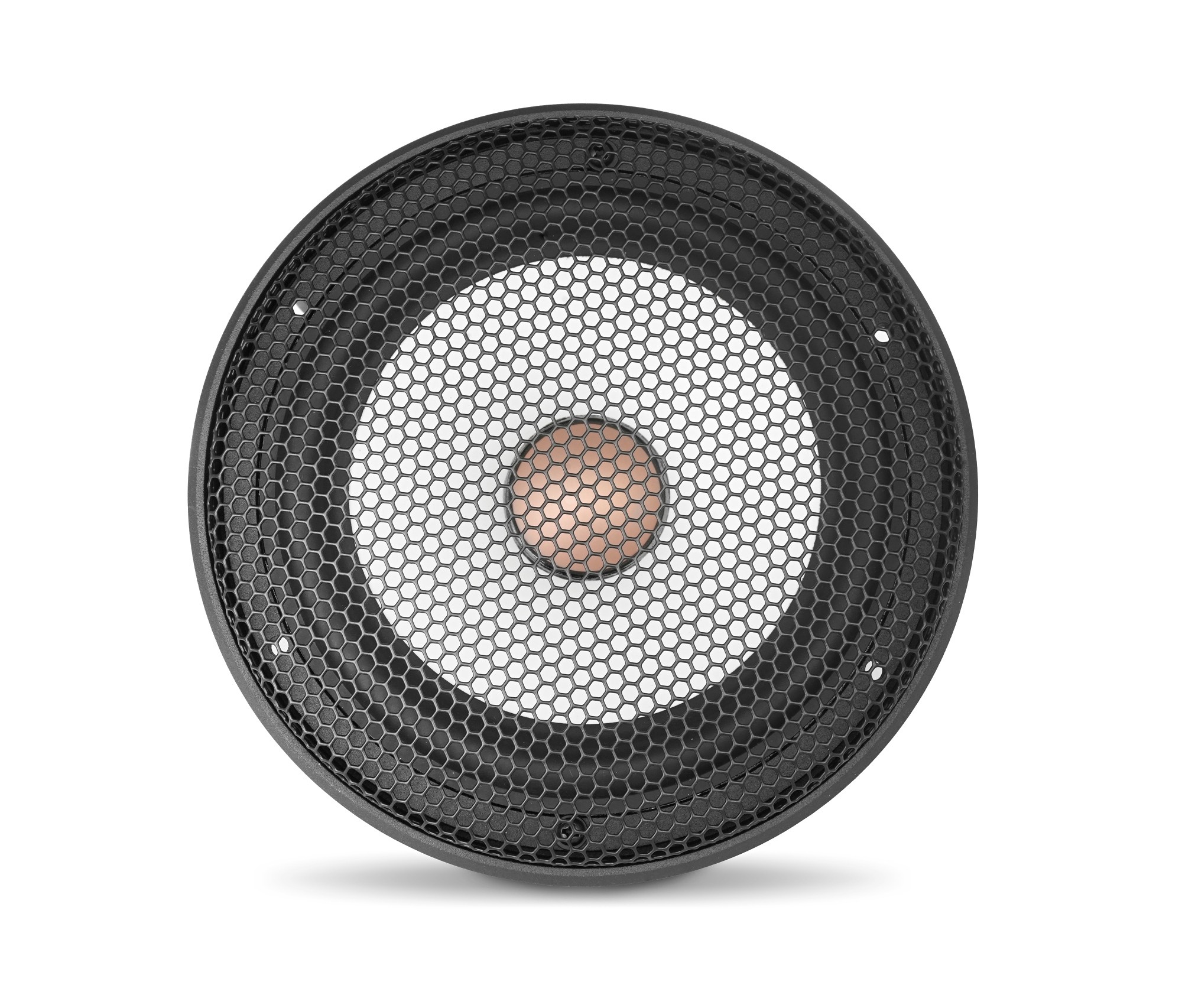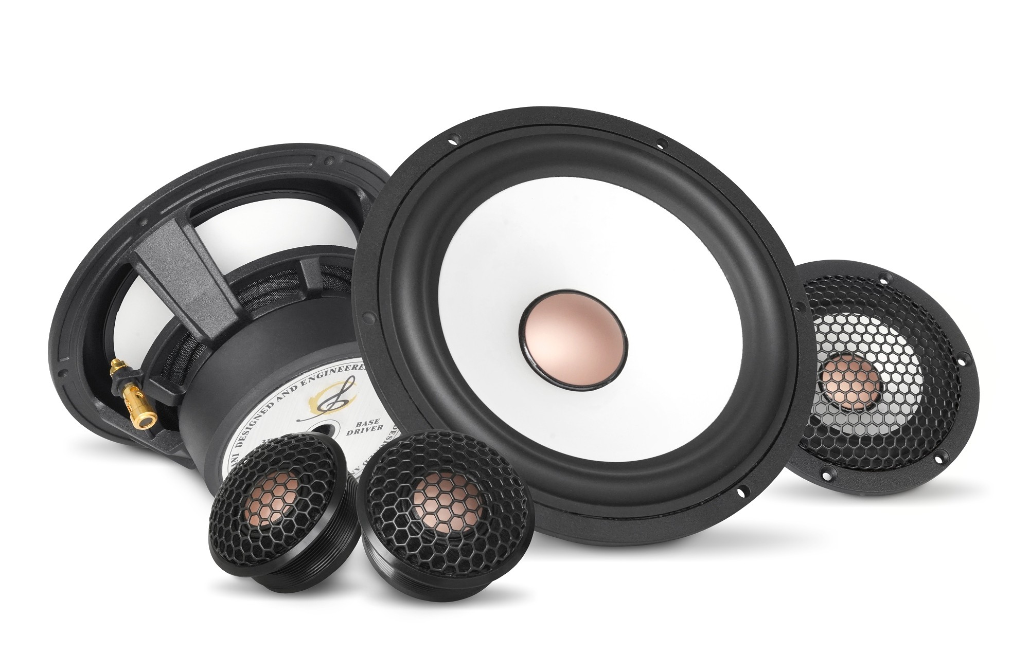 | Тип на високоговорителитеКоаксиални високоговорители: Коаксиалните високоговорители се характеризират с конструкция, наречена всичко в едно. Високочестотният и среднобасовият говорител са в един и същ кош. Предимството е по-лесен монтаж, но поради свързването или близостта на честотните диапазони в един говорител обикновено се понижава качеството на звука. Обикновено в центъра на среднобасовия говорител се намира високочестотният говорител, чиито звукова бобина работи във втората въздушна междина на общия магнитен кръг. Коаксиален говорител с три честотни диапазона се състои от среднобасов говорител, отпред на специален носач е поставен средночестотният говорител и отделен високочестотен. Компонентни високоговорители: Компонентните високоговорители се отличават с разделянето на отделни честотни диапазони: високочестотен + среднобасов + евентуално басов диапазон. Отделните говорители могат да бъдат разположени напълно отделно, което води до по-добро звуково и акустично представяне. В огромното мнозинство от случаите при компонентните високоговорители се доставя и външна кросоувърна мрежа, която разделя високите, средните/среднобасовите и при системи с три честотни диапазона и басовите честоти, както и позволява настройване на нивото в децибели на високочестотния говорител (напр. +2 dB, 0 dB, -2 dB), стръмността (напр. 6 dB/октава, 12 dB/октава) или активно/bi-amp свързване. | Компонентни трилентови |