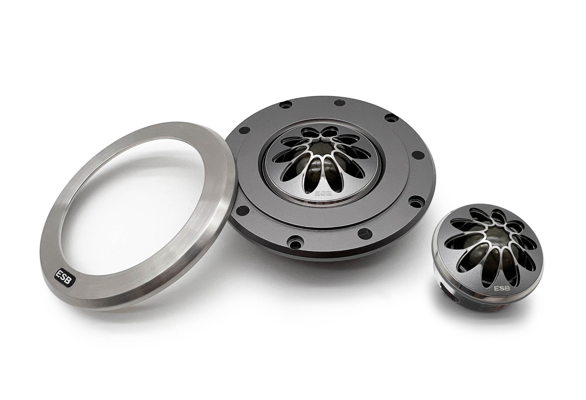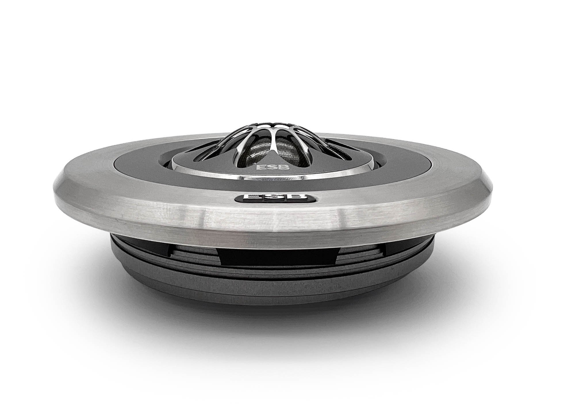 ESB Audio 9.1T-28 представляват по-напредналите високочестотни говорители от двете възможности на серия 9000. Отделните модели се различават по диаметъра на купола и по няколко други параметъра и технологии, но имат много общи технологични и дизайнерски решения. Вероятно първо ще забележите красивия дизайн на високочестотния говорител. Това обаче не е само изражение на италианската естетика, а има своето оправдание. Този дизайн позволява постигане на отлична размерна стабилност и осигурява перфектно свързване на всички части с много ниски допуски, което намалява изкривяванията и подобрява представянето. Специалната форма на предната част на високочестотния говорител подобрява разпространението на звука встрани, намалява отраженията от стъклото на автомобила и създава идеални условия за по-широк ъгъл на слушане. Мембраната е изработена от лек полупрозрачен копърин, който е идеалната комбинация на лекота и здравина и днес вероятно е най-подходящият материал за изключително реалистично възпроизвеждане на музика. Куполът е импрегниран със смола с интегрирано амортизиране и е изработен от едно цяло парче, което включва и окачването. Това значително намалява масата и позволява на високочестотния говорител да достигне много високи честоти. Липсата на съединения предотвратява разпадане и различни вибрационни явления. Сред ексклузивните технологии на говорителите ESB Audio 9.1T-28 са системите FCA и TCA. Първата представлява специална конструкция за управление на въздушния поток, която осигурява контролирано и бързо освобождаване на енергията, натрупана при движението на купола, без да се предизвикват постоянни колебания. Това допринася за по-прецизен и верен отклик към звуковия източник и за общото качество на звуковото преживяване. Системата TCA за регулиране на обратния въздушен поток намалява турбуленциите и шума и управлява заглушаването на купола чрез дозиране на въздушния поток. Медният пръстен на Фарадей помага за намаляване на индуктивността на говорителната бобина за минимален съпротивление при високи честоти. Това осигурява по-добър високочестотен отклик, който позволява на говорителя по-точно да възпроизвежда високи тонове. Намаляването на индуктивността също допринася за по-добро справяне с бързите транзиенти на звуковите сигнали. Това може да подобри способността на говорителя да възпроизвежда транзиентни звукови импулси по-точно. Висококачественият неодимов магнит на високочестотния говорител осигурява огромна магнитна сила дори след часове употреба, когато говорителят е нагрял. Високочестотният говорител съдържа и вторичен, т.нар. надстраховъчен магнит, който служи за стабилизиране и регулиране на магнитния поток и за фокусиране само пред бобината, като по този начин се увеличава ефективността, управляемата мощност, намаляването на изкривяванията и честотната лента. Специалната конструкция на тази магнитна група гарантира, че силовите линии са концентрирани точно там, където е необходимо, без да има изтичания. Голямо внимание е отделено и на корпуса, който е изработен чрез много прецизни CNC машини с цел постигане на много малки допуски за повишаване на ефективността и производителността. Голямата площ помага за намаляване на температурата, за да може високочестотният говорител да функционира безопасно.
