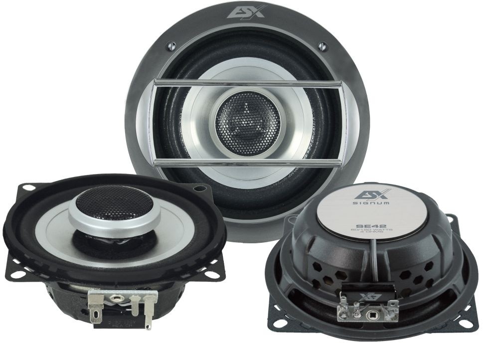 | Тип на високоговорителитеКоаксиални високоговорители: Коаксиалните високоговорители се характеризират с конструкция, наречена всичко в едно. Високочестотният и среднобасовият говорител са в един и същ кош. Предимството е по-лесен монтаж, но поради свързването или близостта на честотните диапазони в един говорител обикновено се понижава качеството на звука. Обикновено в центъра на среднобасовия говорител се намира високочестотният говорител, чиито звукова бобина работи във втората въздушна междина на общия магнитен кръг. Коаксиален говорител с три честотни диапазона се състои от среднобасов говорител, отпред на специален носач е поставен средночестотният говорител и отделен високочестотен. Компонентни високоговорители: Компонентните високоговорители се отличават с разделянето на отделни честотни диапазони: високочестотен + среднобасов + евентуално басов диапазон. Отделните говорители могат да бъдат разположени напълно отделно, което води до по-добро звуково и акустично представяне. В огромното мнозинство от случаите при компонентните високоговорители се доставя и външна кросоувърна мрежа, която разделя високите, средните/среднобасовите и при системи с три честотни диапазона и басовите честоти, както и позволява настройване на нивото в децибели на високочестотния говорител (напр. +2 dB, 0 dB, -2 dB), стръмността (напр. 6 dB/октава, 12 dB/октава) или активно/bi-amp свързване. | коаксиални двулентови |