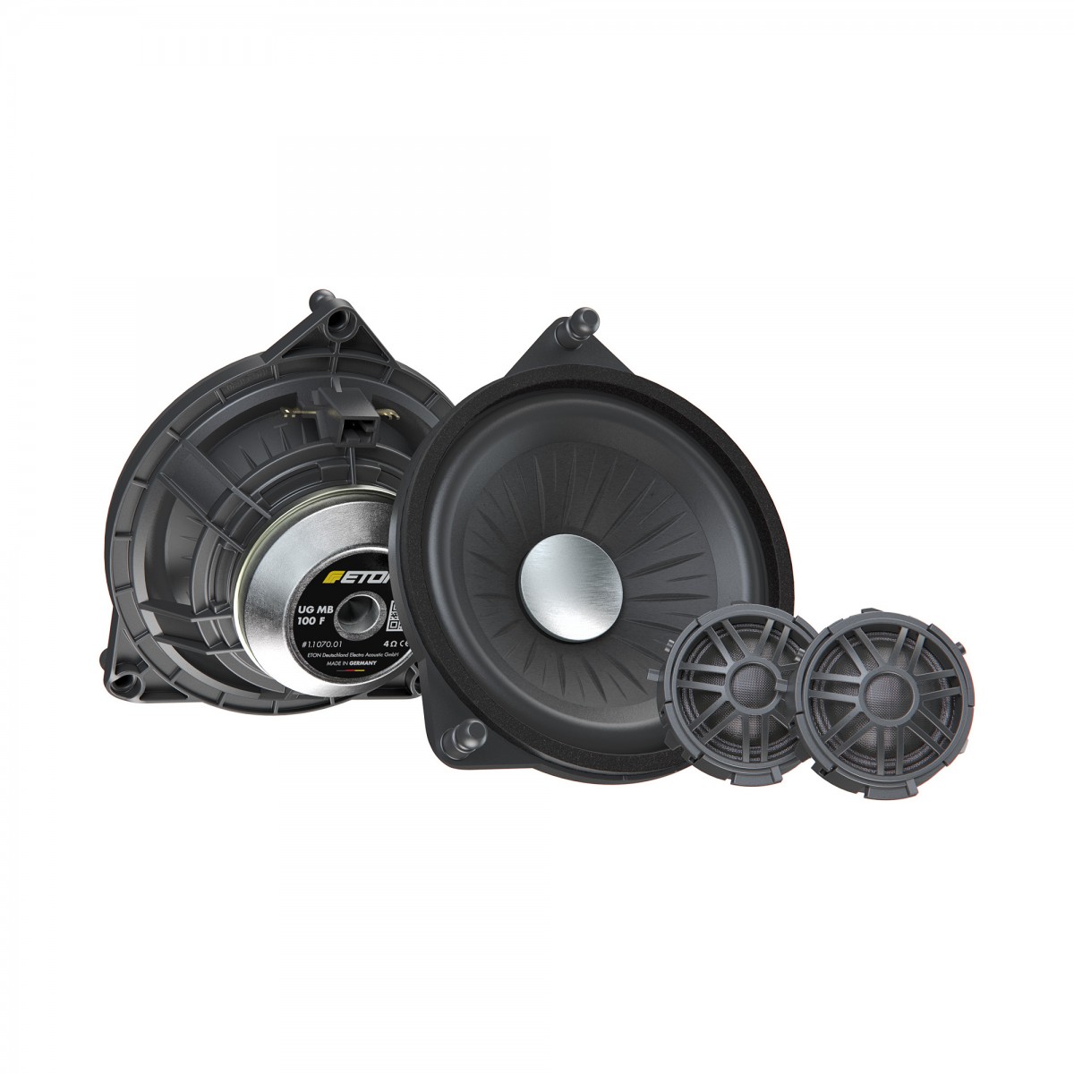 Първокласни 2-полосни 100 mm компонентни Plug & Play говорители за Mercedes-Benz. Говорителите с ребриста и импрегнирана хартиена мембрана и първокласен 25 mm високочестотен говорител са предназначени за предните врати на новите модели Mercedes-Benz. Свързването става с оригиналните конектори Mercedes, не е необходимо да се закупуват други конектори. Кошът на средночестотните говорители е изработен от специален втвърден поликарбонат. В комплекта са включени и малки честотни филтри. Разработено и произведено в Германия.