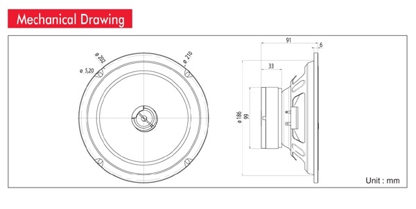 | Диаметър на среднебасовия говорителДиаметърът на говорителя се посочва като диаметър на целия говорител, без да се включват монтажните закрепвания, при които при по-малките говорители (87, 100, 130 mm) закрепванията може да стърчат допълнително. Някои говорители са овални и там размерът се дава в инчове, винаги от най-късата към най-дългата страна. Един инч е приблизително 2,5 cm. | 200 mm |