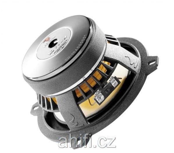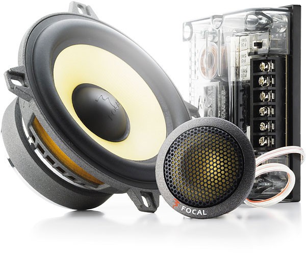 | Тип на високоговорителитеКоаксиални високоговорители: Коаксиалните високоговорители се характеризират с конструкция, наречена всичко в едно. Високочестотният и среднобасовият говорител са в един и същ кош. Предимството е по-лесен монтаж, но поради свързването или близостта на честотните диапазони в един говорител обикновено се понижава качеството на звука. Обикновено в центъра на среднобасовия говорител се намира високочестотният говорител, чиито звукова бобина работи във втората въздушна междина на общия магнитен кръг. Коаксиален говорител с три честотни диапазона се състои от среднобасов говорител, отпред на специален носач е поставен средночестотният говорител и отделен високочестотен. Компонентни високоговорители: Компонентните високоговорители се отличават с разделянето на отделни честотни диапазони: високочестотен + среднобасов + евентуално басов диапазон. Отделните говорители могат да бъдат разположени напълно отделно, което води до по-добро звуково и акустично представяне. В огромното мнозинство от случаите при компонентните високоговорители се доставя и външна кросоувърна мрежа, която разделя високите, средните/среднобасовите и при системи с три честотни диапазона и басовите честоти, както и позволява настройване на нивото в децибели на високочестотния говорител (напр. +2 dB, 0 dB, -2 dB), стръмността (напр. 6 dB/октава, 12 dB/октава) или активно/bi-amp свързване. | компонентни двулентови |