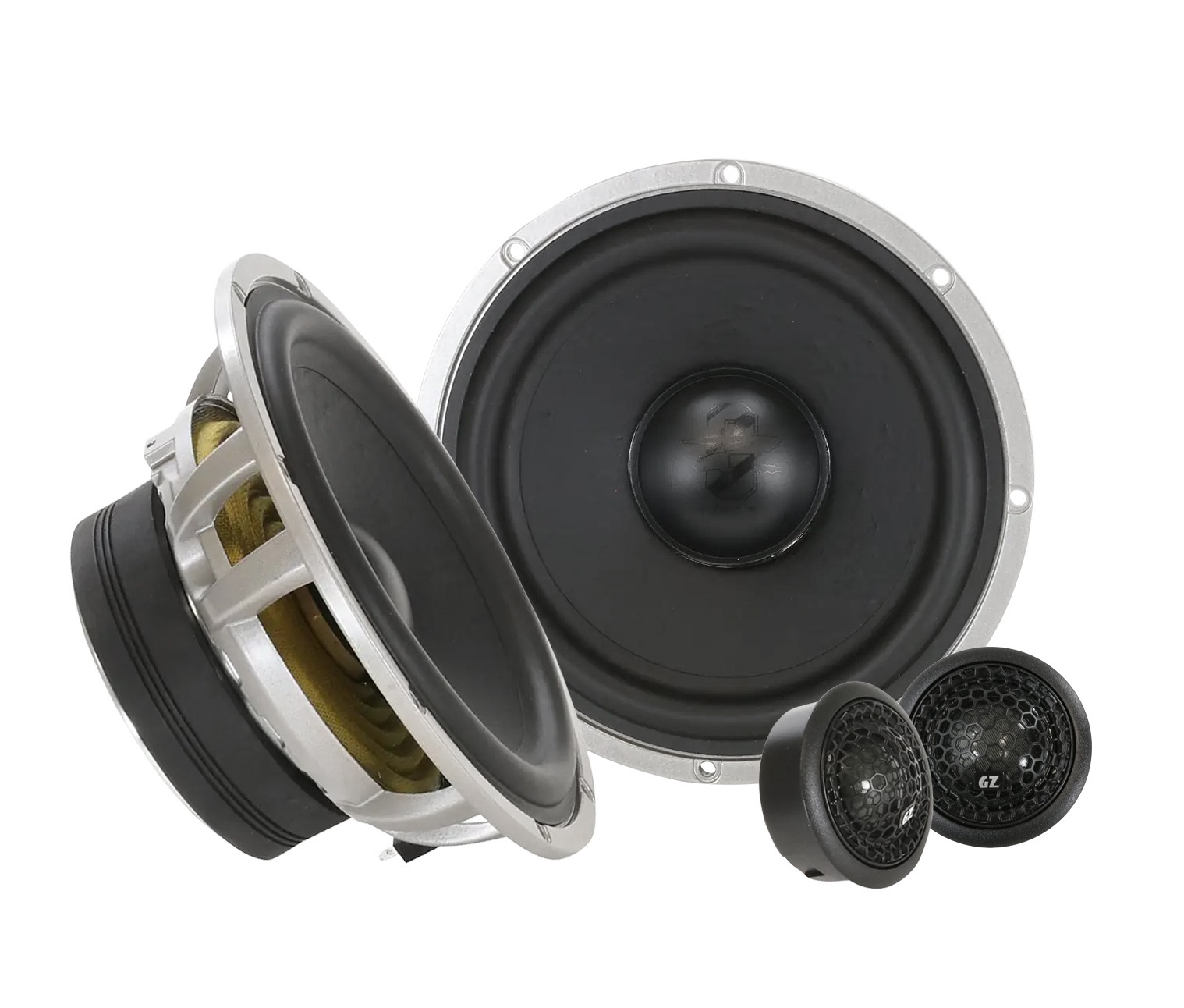 | Тип на високоговорителитеКоаксиални високоговорители: Коаксиалните високоговорители се характеризират с конструкция, наречена всичко в едно. Високочестотният и среднобасовият говорител са в един и същ кош. Предимството е по-лесен монтаж, но поради свързването или близостта на честотните диапазони в един говорител обикновено се понижава качеството на звука. Обикновено в центъра на среднобасовия говорител се намира високочестотният говорител, чиито звукова бобина работи във втората въздушна междина на общия магнитен кръг. Коаксиален говорител с три честотни диапазона се състои от среднобасов говорител, отпред на специален носач е поставен средночестотният говорител и отделен високочестотен. Компонентни високоговорители: Компонентните високоговорители се отличават с разделянето на отделни честотни диапазони: високочестотен + среднобасов + евентуално басов диапазон. Отделните говорители могат да бъдат разположени напълно отделно, което води до по-добро звуково и акустично представяне. В огромното мнозинство от случаите при компонентните високоговорители се доставя и външна кросоувърна мрежа, която разделя високите, средните/среднобасовите и при системи с три честотни диапазона и басовите честоти, както и позволява настройване на нивото в децибели на високочестотния говорител (напр. +2 dB, 0 dB, -2 dB), стръмността (напр. 6 dB/октава, 12 dB/октава) или активно/bi-amp свързване. | Компонентни двулентови |