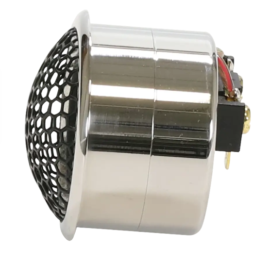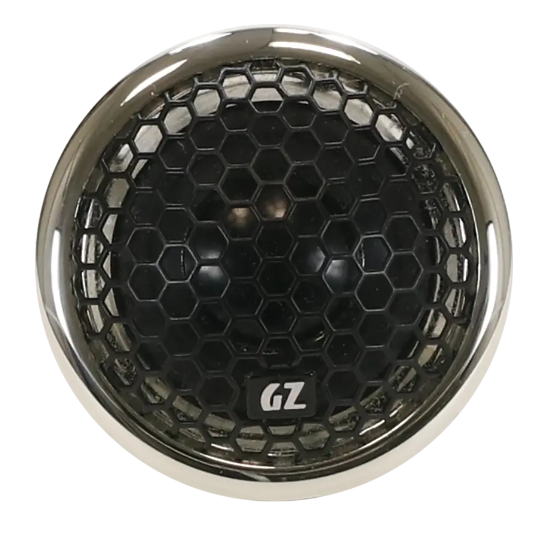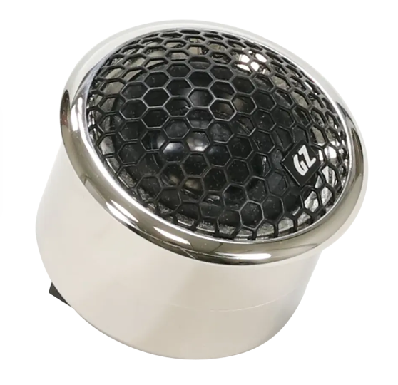 | Тип на високоговорителитеКоаксиални високоговорители: Коаксиалните високоговорители се характеризират с конструкция, наречена всичко в едно. Високочестотният и среднобасовият говорител са в един и същ кош. Предимството е по-лесен монтаж, но поради свързването или близостта на честотните диапазони в един говорител обикновено се понижава качеството на звука. Обикновено в центъра на среднобасовия говорител се намира високочестотният говорител, чиито звукова бобина работи във втората въздушна междина на общия магнитен кръг. Коаксиален говорител с три честотни диапазона се състои от среднобасов говорител, отпред на специален носач е поставен средночестотният говорител и отделен високочестотен. Компонентни високоговорители: Компонентните високоговорители се отличават с разделянето на отделни честотни диапазони: високочестотен + среднобасов + евентуално басов диапазон. Отделните говорители могат да бъдат разположени напълно отделно, което води до по-добро звуково и акустично представяне. В огромното мнозинство от случаите при компонентните високоговорители се доставя и външна кросоувърна мрежа, която разделя високите, средните/среднобасовите и при системи с три честотни диапазона и басовите честоти, както и позволява настройване на нивото в децибели на високочестотния говорител (напр. +2 dB, 0 dB, -2 dB), стръмността (напр. 6 dB/октава, 12 dB/октава) или активно/bi-amp свързване. | Високочестотен |