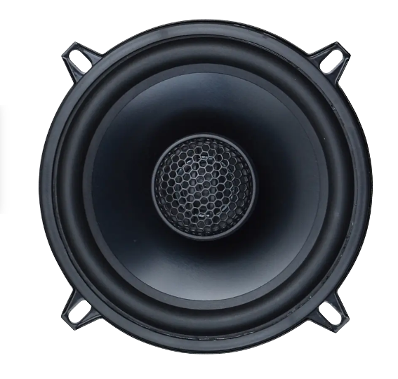 | Тип на високоговорителитеКоаксиални високоговорители: Коаксиалните високоговорители се характеризират с конструкция, наречена всичко в едно. Високочестотният и среднобасовият говорител са в един и същ кош. Предимството е по-лесен монтаж, но поради свързването или близостта на честотните диапазони в един говорител обикновено се понижава качеството на звука. Обикновено в центъра на среднобасовия говорител се намира високочестотният говорител, чиито звукова бобина работи във втората въздушна междина на общия магнитен кръг. Коаксиален говорител с три честотни диапазона се състои от среднобасов говорител, отпред на специален носач е поставен средночестотният говорител и отделен високочестотен. Компонентни високоговорители: Компонентните високоговорители се отличават с разделянето на отделни честотни диапазони: високочестотен + среднобасов + евентуално басов диапазон. Отделните говорители могат да бъдат разположени напълно отделно, което води до по-добро звуково и акустично представяне. В огромното мнозинство от случаите при компонентните високоговорители се доставя и външна кросоувърна мрежа, която разделя високите, средните/среднобасовите и при системи с три честотни диапазона и басовите честоти, както и позволява настройване на нивото в децибели на високочестотния говорител (напр. +2 dB, 0 dB, -2 dB), стръмността (напр. 6 dB/октава, 12 dB/октава) или активно/bi-amp свързване. | Коаксиални 2-пътни |