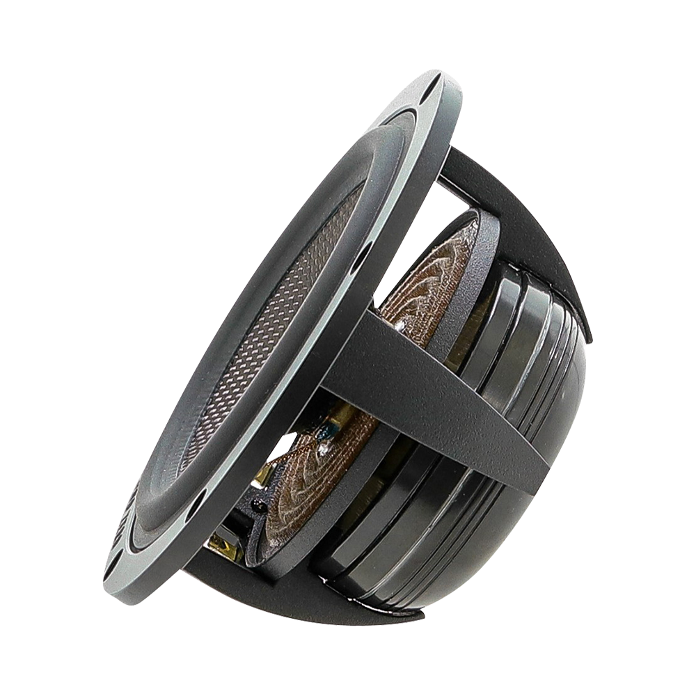 | Тип на високоговорителитеКоаксиални високоговорители: Коаксиалните високоговорители се характеризират с конструкция, наречена всичко в едно. Високочестотният и среднобасовият говорител са в един и същ кош. Предимството е по-лесен монтаж, но поради свързването или близостта на честотните диапазони в един говорител обикновено се понижава качеството на звука. Обикновено в центъра на среднобасовия говорител се намира високочестотният говорител, чиито звукова бобина работи във втората въздушна междина на общия магнитен кръг. Коаксиален говорител с три честотни диапазона се състои от среднобасов говорител, отпред на специален носач е поставен средночестотният говорител и отделен високочестотен. Компонентни високоговорители: Компонентните високоговорители се отличават с разделянето на отделни честотни диапазони: високочестотен + среднобасов + евентуално басов диапазон. Отделните говорители могат да бъдат разположени напълно отделно, което води до по-добро звуково и акустично представяне. В огромното мнозинство от случаите при компонентните високоговорители се доставя и външна кросоувърна мрежа, която разделя високите, средните/среднобасовите и при системи с три честотни диапазона и басовите честоти, както и позволява настройване на нивото в децибели на високочестотния говорител (напр. +2 dB, 0 dB, -2 dB), стръмността (напр. 6 dB/октава, 12 dB/октава) или активно/bi-amp свързване. | Мидбасови |