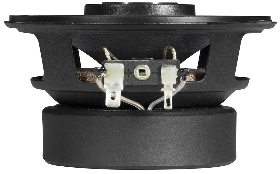 | Тип на високоговорителитеКоаксиални високоговорители: Коаксиалните високоговорители се характеризират с конструкция, наречена всичко в едно. Високочестотният и среднобасовият говорител са в един и същ кош. Предимството е по-лесен монтаж, но поради свързването или близостта на честотните диапазони в един говорител обикновено се понижава качеството на звука. Обикновено в центъра на среднобасовия говорител се намира високочестотният говорител, чиито звукова бобина работи във втората въздушна междина на общия магнитен кръг. Коаксиален говорител с три честотни диапазона се състои от среднобасов говорител, отпред на специален носач е поставен средночестотният говорител и отделен високочестотен. Компонентни високоговорители: Компонентните високоговорители се отличават с разделянето на отделни честотни диапазони: високочестотен + среднобасов + евентуално басов диапазон. Отделните говорители могат да бъдат разположени напълно отделно, което води до по-добро звуково и акустично представяне. В огромното мнозинство от случаите при компонентните високоговорители се доставя и външна кросоувърна мрежа, която разделя високите, средните/среднобасовите и при системи с три честотни диапазона и басовите честоти, както и позволява настройване на нивото в децибели на високочестотния говорител (напр. +2 dB, 0 dB, -2 dB), стръмността (напр. 6 dB/октава, 12 dB/октава) или активно/bi-amp свързване. | Коаксиални 2-полосни |