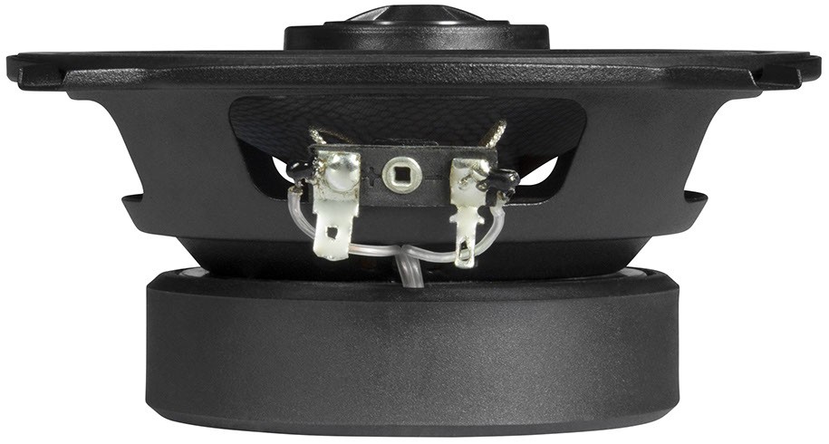 | Тип на високоговорителитеКоаксиални високоговорители: Коаксиалните високоговорители се характеризират с конструкция, наречена всичко в едно. Високочестотният и среднобасовият говорител са в един и същ кош. Предимството е по-лесен монтаж, но поради свързването или близостта на честотните диапазони в един говорител обикновено се понижава качеството на звука. Обикновено в центъра на среднобасовия говорител се намира високочестотният говорител, чиито звукова бобина работи във втората въздушна междина на общия магнитен кръг. Коаксиален говорител с три честотни диапазона се състои от среднобасов говорител, отпред на специален носач е поставен средночестотният говорител и отделен високочестотен. Компонентни високоговорители: Компонентните високоговорители се отличават с разделянето на отделни честотни диапазони: високочестотен + среднобасов + евентуално басов диапазон. Отделните говорители могат да бъдат разположени напълно отделно, което води до по-добро звуково и акустично представяне. В огромното мнозинство от случаите при компонентните високоговорители се доставя и външна кросоувърна мрежа, която разделя високите, средните/среднобасовите и при системи с три честотни диапазона и басовите честоти, както и позволява настройване на нивото в децибели на високочестотния говорител (напр. +2 dB, 0 dB, -2 dB), стръмността (напр. 6 dB/октава, 12 dB/октава) или активно/bi-amp свързване. | Коаксиален 2-пътен |