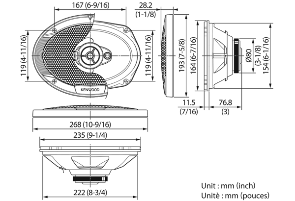 | Диаметър на среднебасовия говорителДиаметърът на говорителя се посочва като диаметър на целия говорител, без да се включват монтажните закрепвания, при които при по-малките говорители (87, 100, 130 mm) закрепванията може да стърчат допълнително. Някои говорители са овални и там размерът се дава в инчове, винаги от най-късата към най-дългата страна. Един инч е приблизително 2,5 cm. | 6 x 9" |