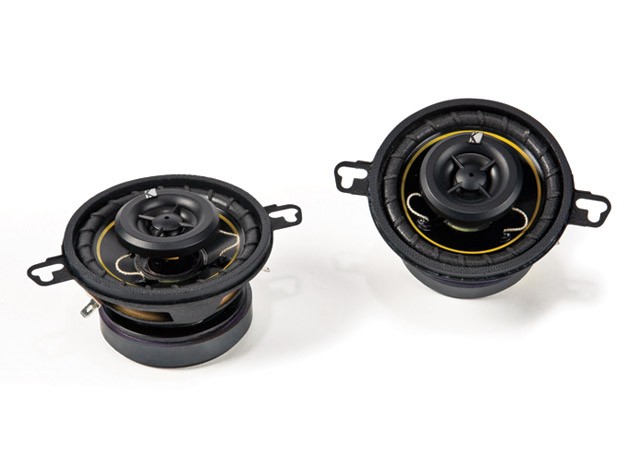 | Тип на високоговорителитеКоаксиални високоговорители: Коаксиалните високоговорители се характеризират с конструкция, наречена всичко в едно. Високочестотният и среднобасовият говорител са в един и същ кош. Предимството е по-лесен монтаж, но поради свързването или близостта на честотните диапазони в един говорител обикновено се понижава качеството на звука. Обикновено в центъра на среднобасовия говорител се намира високочестотният говорител, чиито звукова бобина работи във втората въздушна междина на общия магнитен кръг. Коаксиален говорител с три честотни диапазона се състои от среднобасов говорител, отпред на специален носач е поставен средночестотният говорител и отделен високочестотен. Компонентни високоговорители: Компонентните високоговорители се отличават с разделянето на отделни честотни диапазони: високочестотен + среднобасов + евентуално басов диапазон. Отделните говорители могат да бъдат разположени напълно отделно, което води до по-добро звуково и акустично представяне. В огромното мнозинство от случаите при компонентните високоговорители се доставя и външна кросоувърна мрежа, която разделя високите, средните/среднобасовите и при системи с три честотни диапазона и басовите честоти, както и позволява настройване на нивото в децибели на високочестотния говорител (напр. +2 dB, 0 dB, -2 dB), стръмността (напр. 6 dB/октава, 12 dB/октава) или активно/bi-amp свързване. | коаксиален 3-посочен |