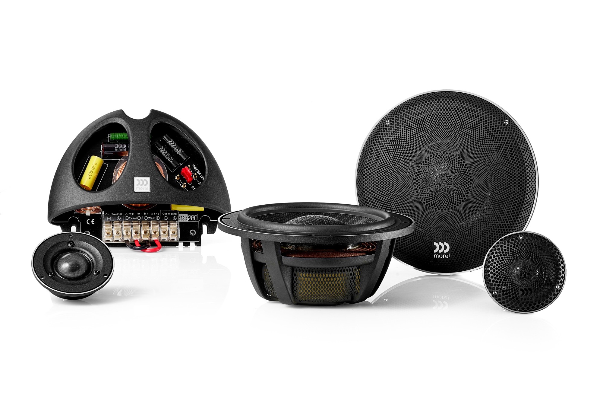 | Тип на високоговорителитеКоаксиални високоговорители: Коаксиалните високоговорители се характеризират с конструкция, наречена всичко в едно. Високочестотният и среднобасовият говорител са в един и същ кош. Предимството е по-лесен монтаж, но поради свързването или близостта на честотните диапазони в един говорител обикновено се понижава качеството на звука. Обикновено в центъра на среднобасовия говорител се намира високочестотният говорител, чиито звукова бобина работи във втората въздушна междина на общия магнитен кръг. Коаксиален говорител с три честотни диапазона се състои от среднобасов говорител, отпред на специален носач е поставен средночестотният говорител и отделен високочестотен. Компонентни високоговорители: Компонентните високоговорители се отличават с разделянето на отделни честотни диапазони: високочестотен + среднобасов + евентуално басов диапазон. Отделните говорители могат да бъдат разположени напълно отделно, което води до по-добро звуково и акустично представяне. В огромното мнозинство от случаите при компонентните високоговорители се доставя и външна кросоувърна мрежа, която разделя високите, средните/среднобасовите и при системи с три честотни диапазона и басовите честоти, както и позволява настройване на нивото в децибели на високочестотния говорител (напр. +2 dB, 0 dB, -2 dB), стръмността (напр. 6 dB/октава, 12 dB/октава) или активно/bi-amp свързване. | Компонентни 2-полосни |