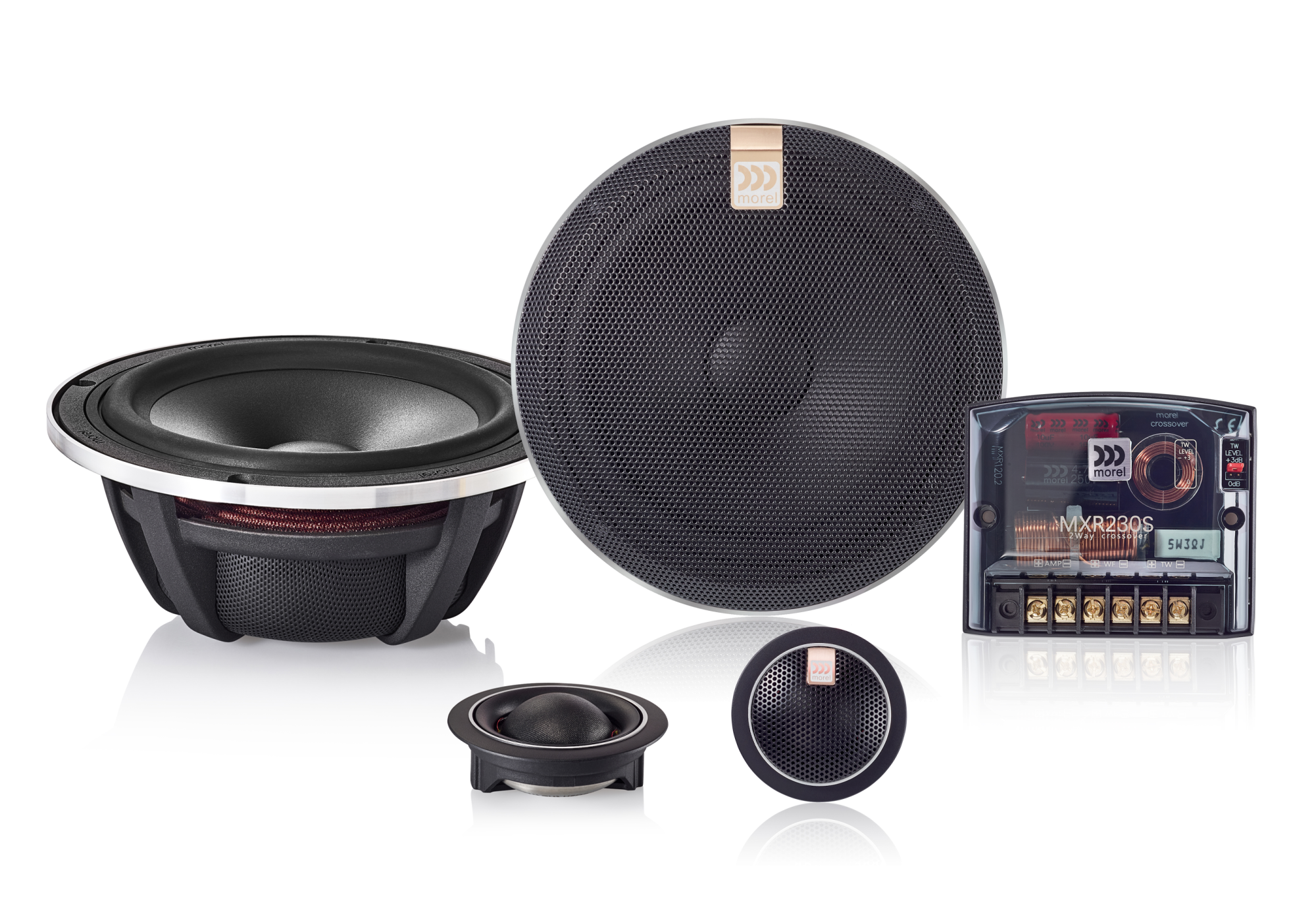 Средночестотният говорител е оборудван, както при по-високата моделна серия Hybrid, с леян алуминиев кош Uniflow™, който предлага значително по-голяма здравина в сравнение със стандартните кошове, минимални вибрации и подобрен басов отговор. Вътре в коша е разположен голям феритов магнит, който заедно с предимензонираната подвижна бобина допринася за висока ефективност и ниски изкривявания. Важна част от средночестотния говорител е разбира се и мембраната. Тя е изработена от материал DPC (Damped Polymer Cone), който е пряк наследник на оригиналните мембрани, с които Morel е изградил своята репутация. Благодарение и на отличните самозаглушителни свойства, тази мембрана осигурява изключително качество на звука без оцветяване. Защитната решетка е включена в комплекта.