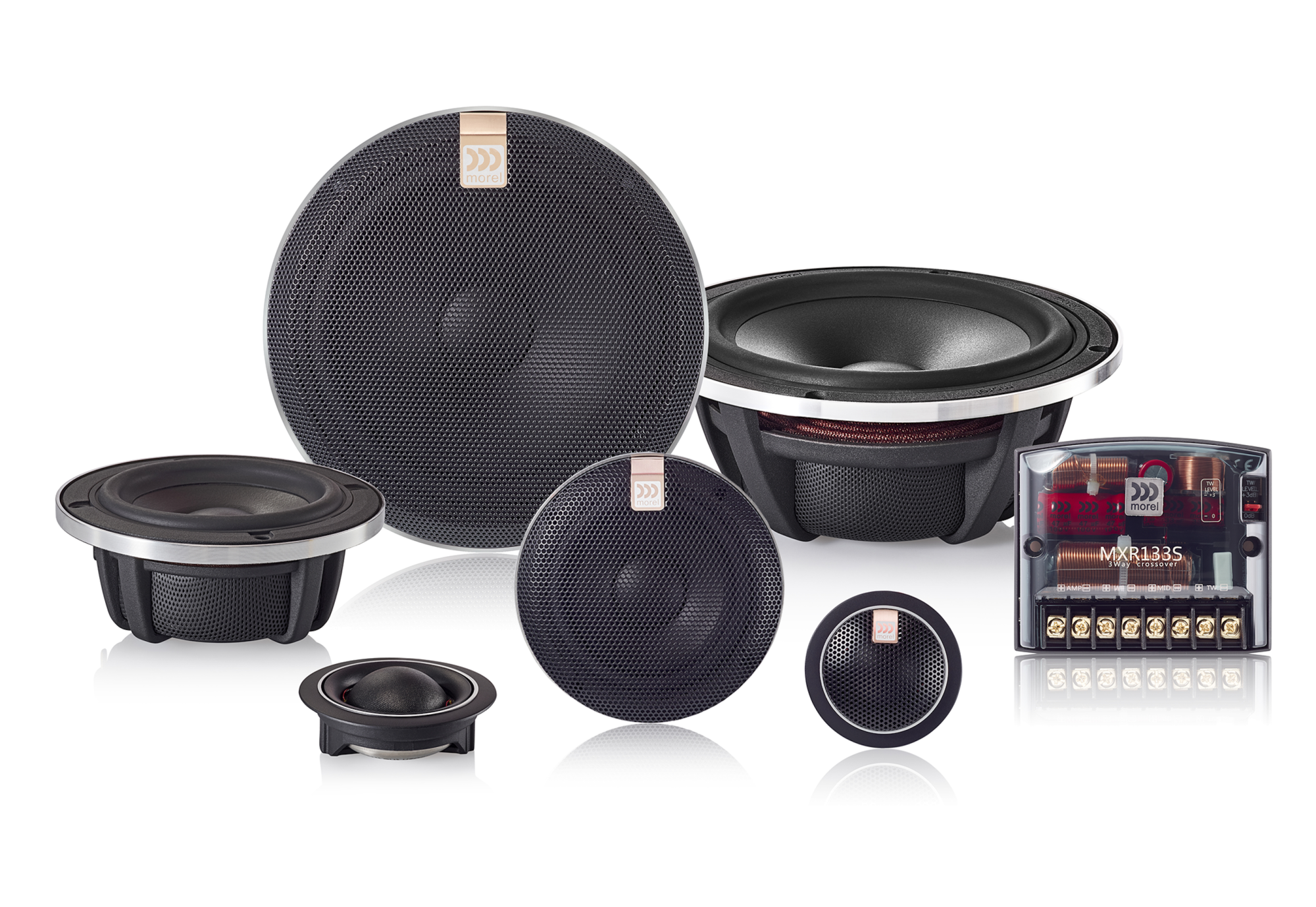 | Тип на високоговорителитеКоаксиални високоговорители: Коаксиалните високоговорители се характеризират с конструкция, наречена всичко в едно. Високочестотният и среднобасовият говорител са в един и същ кош. Предимството е по-лесен монтаж, но поради свързването или близостта на честотните диапазони в един говорител обикновено се понижава качеството на звука. Обикновено в центъра на среднобасовия говорител се намира високочестотният говорител, чиито звукова бобина работи във втората въздушна междина на общия магнитен кръг. Коаксиален говорител с три честотни диапазона се състои от среднобасов говорител, отпред на специален носач е поставен средночестотният говорител и отделен високочестотен. Компонентни високоговорители: Компонентните високоговорители се отличават с разделянето на отделни честотни диапазони: високочестотен + среднобасов + евентуално басов диапазон. Отделните говорители могат да бъдат разположени напълно отделно, което води до по-добро звуково и акустично представяне. В огромното мнозинство от случаите при компонентните високоговорители се доставя и външна кросоувърна мрежа, която разделя високите, средните/среднобасовите и при системи с три честотни диапазона и басовите честоти, както и позволява настройване на нивото в децибели на високочестотния говорител (напр. +2 dB, 0 dB, -2 dB), стръмността (напр. 6 dB/октава, 12 dB/октава) или активно/bi-amp свързване. | Компонентни 3-посочни |