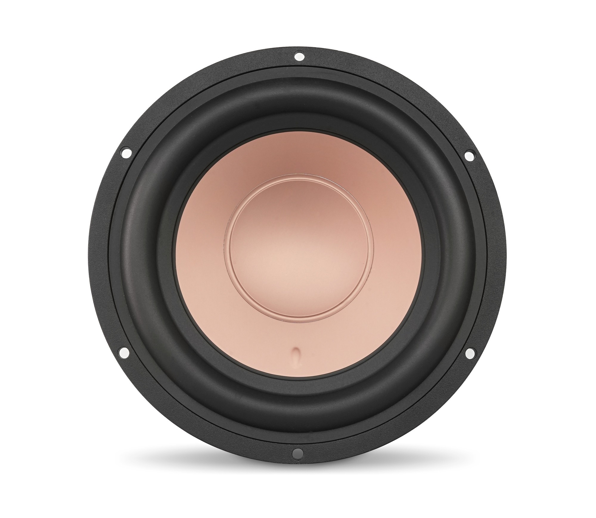 У средночестотните говорители RG 6 HD на първо място привлича вниманието прекрасният дизайн на мембраната. Комбинацията от черно и медно е невероятно елегантна и много нетрадиционна. Не по-малко интересен е и съставът на мембраната и използваните технологии. Мембраната е изработена от патентования материал Matrix Alloy Dome от магнезиево-алуминиева сплав. Тази комбинация се отличава с отлична твърдост, способност за демпфиране на вибрации и изключителна лекота, което позволява възпроизвеждане на дълбоки и впечатляващи баси при запазване на чисти и прецизни средни честоти. Това, което наистина отличава тези говорители от конкуренцията, е изместването на мембраната, което е адаптирано и към шасито на говорителя. Това технологично сложно решение значително подобрява общата честотна характеристика, невъзможна при използване на класическа мембрана. Този дизайн усилва мембраната без да увеличава теглото и също така увеличава ефективната площ на мембраната, което ще усетите в представянето на басовия компонент. Заслужава да се отбележи и изключително равната честотна характеристика на средночестотния говорител, характерна за всички говорители Audible Physics и RG Sound Labs. При обръщане на средночестотния говорител се разкрива още една красота – отлято шаси с мощни керамични магнити, отново в черно-медна комбинация. Специално проектираното отлято шаси е изключително твърдо, елиминира вибрациите и не се деформира толкова при движение на мембраната, както при класическите стоманени шасита. В същото време не намалява магнитното поле и отвежда значително по-ефективно топлината от подвижната бобина. На шасито привличат вниманието и масивните позлатени кабелни терминали, които обикновено виждаме при класическите субуфери. Бобината и други медни компоненти са изработени от най-висококачествената мед, внасяна от Япония и Русия, известна с изключителната си проводимост и издръжливост. В комплекта ще намерите и дизайнерски хексагонални решетки за средночестотните говорители.Високочестотни говорители RG Sound Labs RG 1 HD