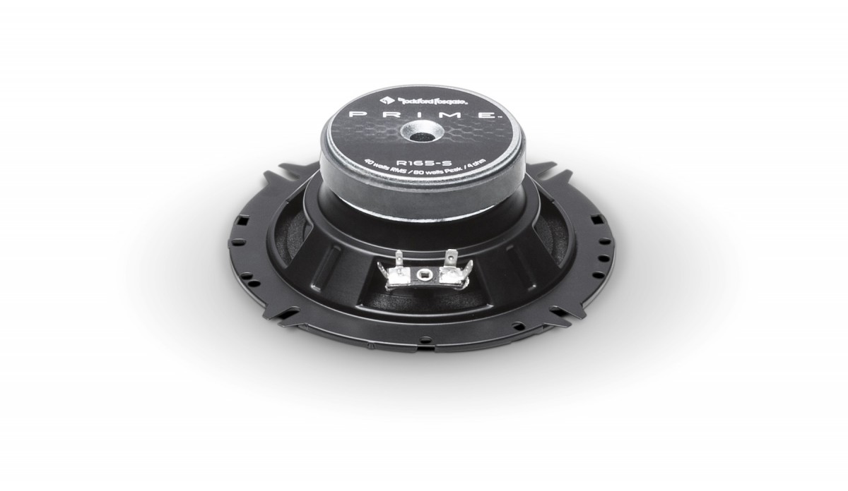 \n\nКомпонентната серия високоговорители PRIME е ново поколение говорители, които заменят фабричното аудио оборудване на вашия автомобил с напълно автентичен звук от Rockford Fosgate. Моделът R165-S е двуканална компонентна система с полипропиленова диафрагма, подсилена със слюда, която осигурява разширение на честотната характеристика. Освен това тези говорители са много лесни за инсталиране и могат да заменят оригиналния комплект говорители без затруднения. Високочестотният говорител има миlar купол, благодарение на който ще се радвате на кристално чисти високи тонове, включва in-line кросоувър за лесен монтаж и допълнително е възможно да се регулира височината на инсталацията, за да се приспособи към повърхността и ъгъла на монтажа.