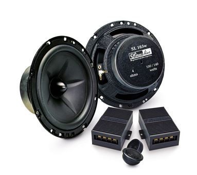 | Тип на високоговорителитеКоаксиални високоговорители: Коаксиалните високоговорители се характеризират с конструкция, наречена всичко в едно. Високочестотният и среднобасовият говорител са в един и същ кош. Предимството е по-лесен монтаж, но поради свързването или близостта на честотните диапазони в един говорител обикновено се понижава качеството на звука. Обикновено в центъра на среднобасовия говорител се намира високочестотният говорител, чиито звукова бобина работи във втората въздушна междина на общия магнитен кръг. Коаксиален говорител с три честотни диапазона се състои от среднобасов говорител, отпред на специален носач е поставен средночестотният говорител и отделен високочестотен. Компонентни високоговорители: Компонентните високоговорители се отличават с разделянето на отделни честотни диапазони: високочестотен + среднобасов + евентуално басов диапазон. Отделните говорители могат да бъдат разположени напълно отделно, което води до по-добро звуково и акустично представяне. В огромното мнозинство от случаите при компонентните високоговорители се доставя и външна кросоувърна мрежа, която разделя високите, средните/среднобасовите и при системи с три честотни диапазона и басовите честоти, както и позволява настройване на нивото в децибели на високочестотния говорител (напр. +2 dB, 0 dB, -2 dB), стръмността (напр. 6 dB/октава, 12 dB/октава) или активно/bi-amp свързване. | Компонентни 2-посочни |