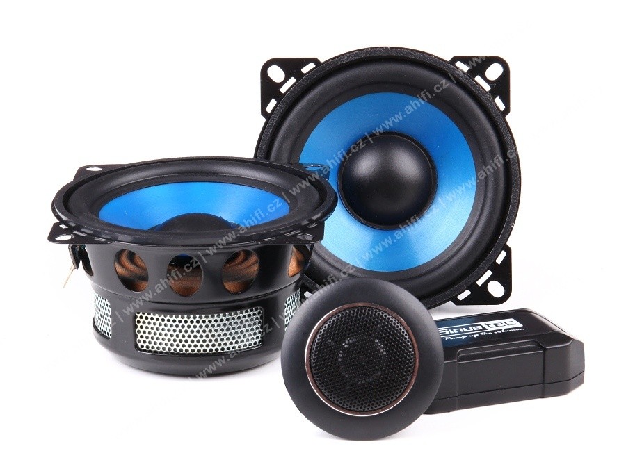 | Тип на високоговорителитеКоаксиални високоговорители: Коаксиалните високоговорители се характеризират с конструкция, наречена всичко в едно. Високочестотният и среднобасовият говорител са в един и същ кош. Предимството е по-лесен монтаж, но поради свързването или близостта на честотните диапазони в един говорител обикновено се понижава качеството на звука. Обикновено в центъра на среднобасовия говорител се намира високочестотният говорител, чиито звукова бобина работи във втората въздушна междина на общия магнитен кръг. Коаксиален говорител с три честотни диапазона се състои от среднобасов говорител, отпред на специален носач е поставен средночестотният говорител и отделен високочестотен. Компонентни високоговорители: Компонентните високоговорители се отличават с разделянето на отделни честотни диапазони: високочестотен + среднобасов + евентуално басов диапазон. Отделните говорители могат да бъдат разположени напълно отделно, което води до по-добро звуково и акустично представяне. В огромното мнозинство от случаите при компонентните високоговорители се доставя и външна кросоувърна мрежа, която разделя високите, средните/среднобасовите и при системи с три честотни диапазона и басовите честоти, както и позволява настройване на нивото в децибели на високочестотния говорител (напр. +2 dB, 0 dB, -2 dB), стръмността (напр. 6 dB/октава, 12 dB/октава) или активно/bi-amp свързване. | Компонентни 2-лентови |