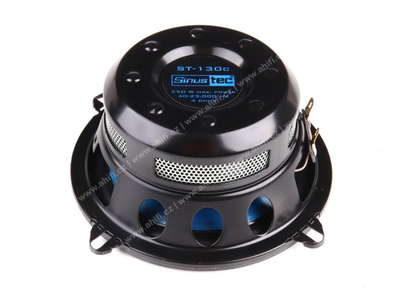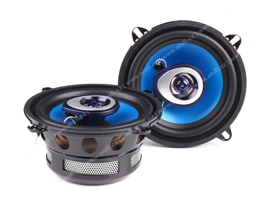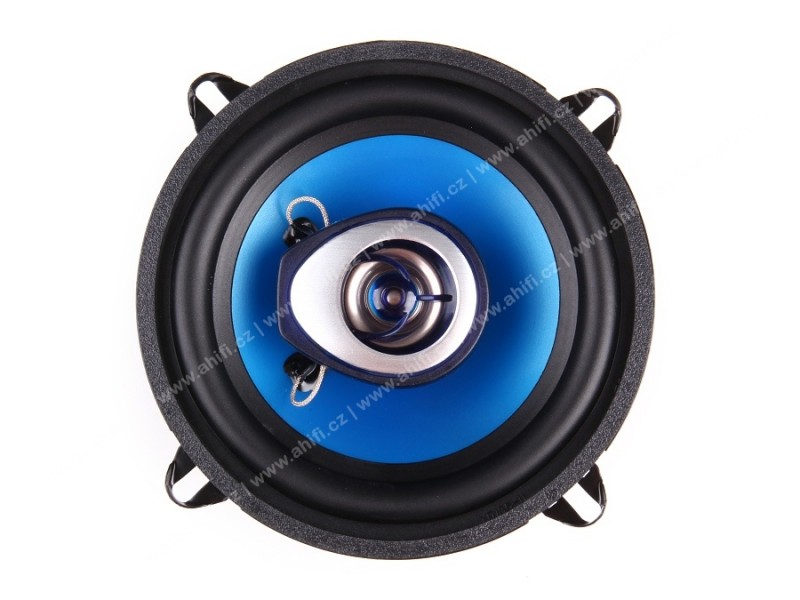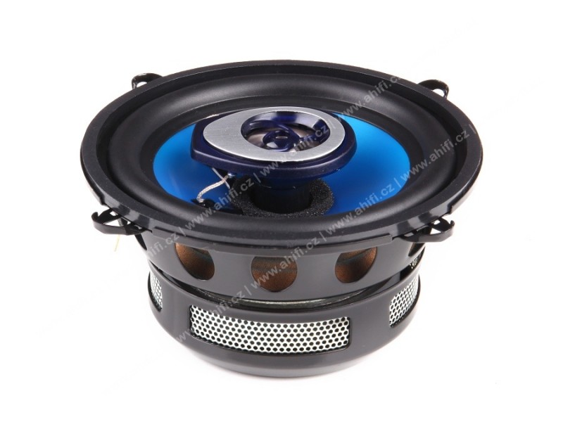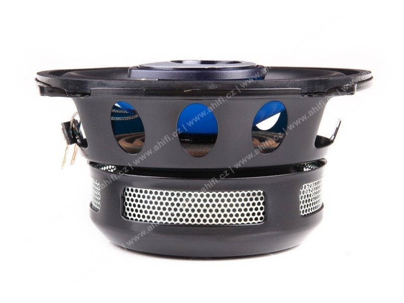 | Тип на високоговорителитеКоаксиални високоговорители: Коаксиалните високоговорители се характеризират с конструкция, наречена всичко в едно. Високочестотният и среднобасовият говорител са в един и същ кош. Предимството е по-лесен монтаж, но поради свързването или близостта на честотните диапазони в един говорител обикновено се понижава качеството на звука. Обикновено в центъра на среднобасовия говорител се намира високочестотният говорител, чиито звукова бобина работи във втората въздушна междина на общия магнитен кръг. Коаксиален говорител с три честотни диапазона се състои от среднобасов говорител, отпред на специален носач е поставен средночестотният говорител и отделен високочестотен. Компонентни високоговорители: Компонентните високоговорители се отличават с разделянето на отделни честотни диапазони: високочестотен + среднобасов + евентуално басов диапазон. Отделните говорители могат да бъдат разположени напълно отделно, което води до по-добро звуково и акустично представяне. В огромното мнозинство от случаите при компонентните високоговорители се доставя и външна кросоувърна мрежа, която разделя високите, средните/среднобасовите и при системи с три честотни диапазона и басовите честоти, както и позволява настройване на нивото в децибели на високочестотния говорител (напр. +2 dB, 0 dB, -2 dB), стръмността (напр. 6 dB/октава, 12 dB/октава) или активно/bi-amp свързване. | Коаксиален 2-пътен |