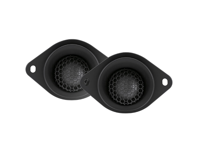 | Тип на високоговорителитеКоаксиални високоговорители: Коаксиалните високоговорители се характеризират с конструкция, наречена всичко в едно. Високочестотният и среднобасовият говорител са в един и същ кош. Предимството е по-лесен монтаж, но поради свързването или близостта на честотните диапазони в един говорител обикновено се понижава качеството на звука. Обикновено в центъра на среднобасовия говорител се намира високочестотният говорител, чиито звукова бобина работи във втората въздушна междина на общия магнитен кръг. Коаксиален говорител с три честотни диапазона се състои от среднобасов говорител, отпред на специален носач е поставен средночестотният говорител и отделен високочестотен. Компонентни високоговорители: Компонентните високоговорители се отличават с разделянето на отделни честотни диапазони: високочестотен + среднобасов + евентуално басов диапазон. Отделните говорители могат да бъдат разположени напълно отделно, което води до по-добро звуково и акустично представяне. В огромното мнозинство от случаите при компонентните високоговорители се доставя и външна кросоувърна мрежа, която разделя високите, средните/среднобасовите и при системи с три честотни диапазона и басовите честоти, както и позволява настройване на нивото в децибели на високочестотния говорител (напр. +2 dB, 0 dB, -2 dB), стръмността (напр. 6 dB/октава, 12 dB/октава) или активно/bi-amp свързване. | Компонентни 2-лентови |
