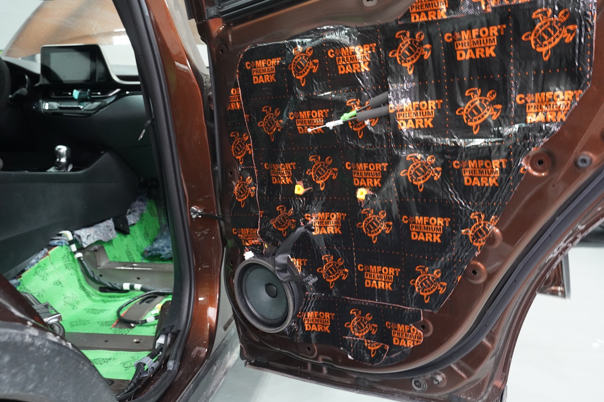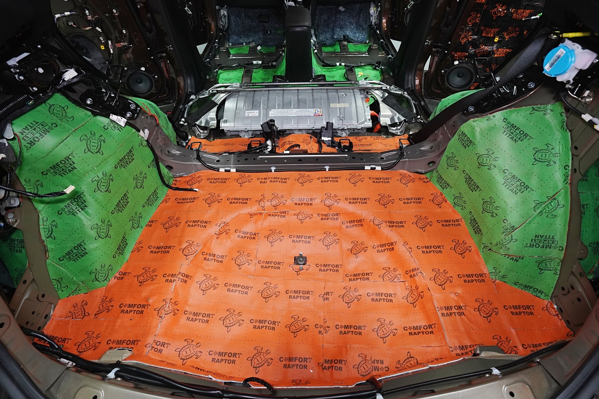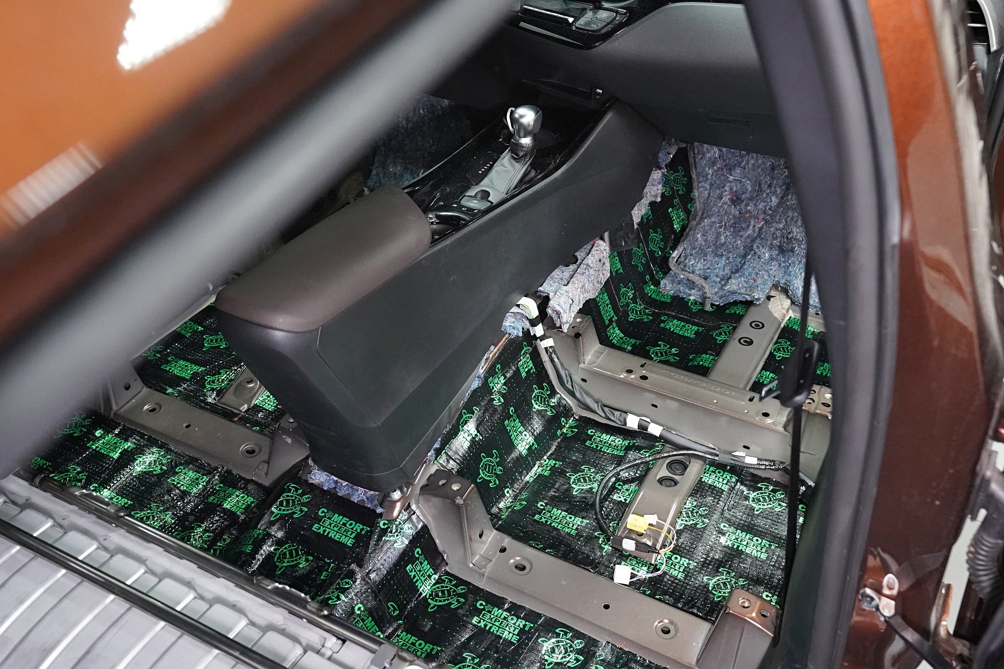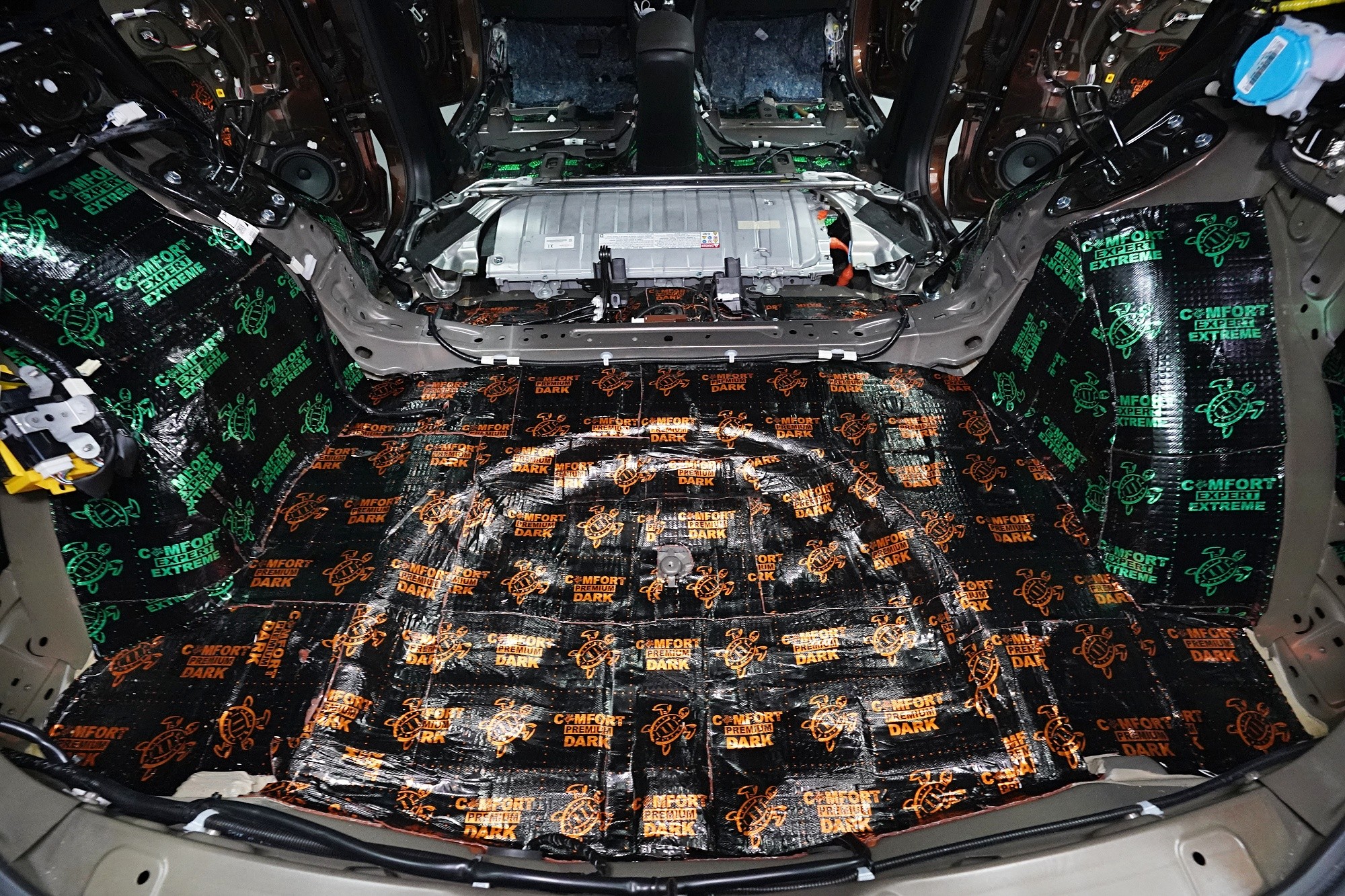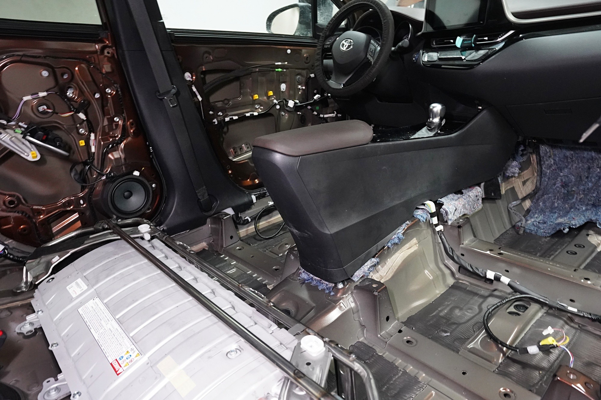 Toyota CHR Hybrid и нашата шумоизолация в рамките на най-ефективния пакет Expert Plus. Практически липсващата звукова изолация се проявява чрез силен шум от гумите, вода и камъчета в калниците, шум от вятъра при високи скорости, както и скърцане на пластмасите. Всичко това намалява комфорта при шофиране на този автомобил и затова собственикът се обърна към нас. След нашата шумоизолация изчезват вибрациите от двигателя, трансмисията или окачването, както и въздушно-преносимият шум на различни честоти от областта на пода, предните и задните калници и разбира се от вратите и задната част на автомобила. Съвместно със собственика се договорихме за нашия най-ефективен пакет шумоизолация Expert Plus. В сравнение с класическия пакет Expert избираме по-ефективни и по-дебели материали и повече слоеве с фокус най-вече върху пода и задните калници на автомобила. Конкретно шумоизолираме предните, задните и петите врати, пода, багажното пространство, покрива, предните и задните калници от вътрешната страна, таблото и капака на двигателя. Всички важни области на автомобила са шумоизолирани с модерни двуслойни материали и в резултат са приложени четири слоя шумоизолация с различни свойства. За шумоизолацията едновременно работят четирима наши техници, които извършват монтажа в рамките на 1 работен ден.