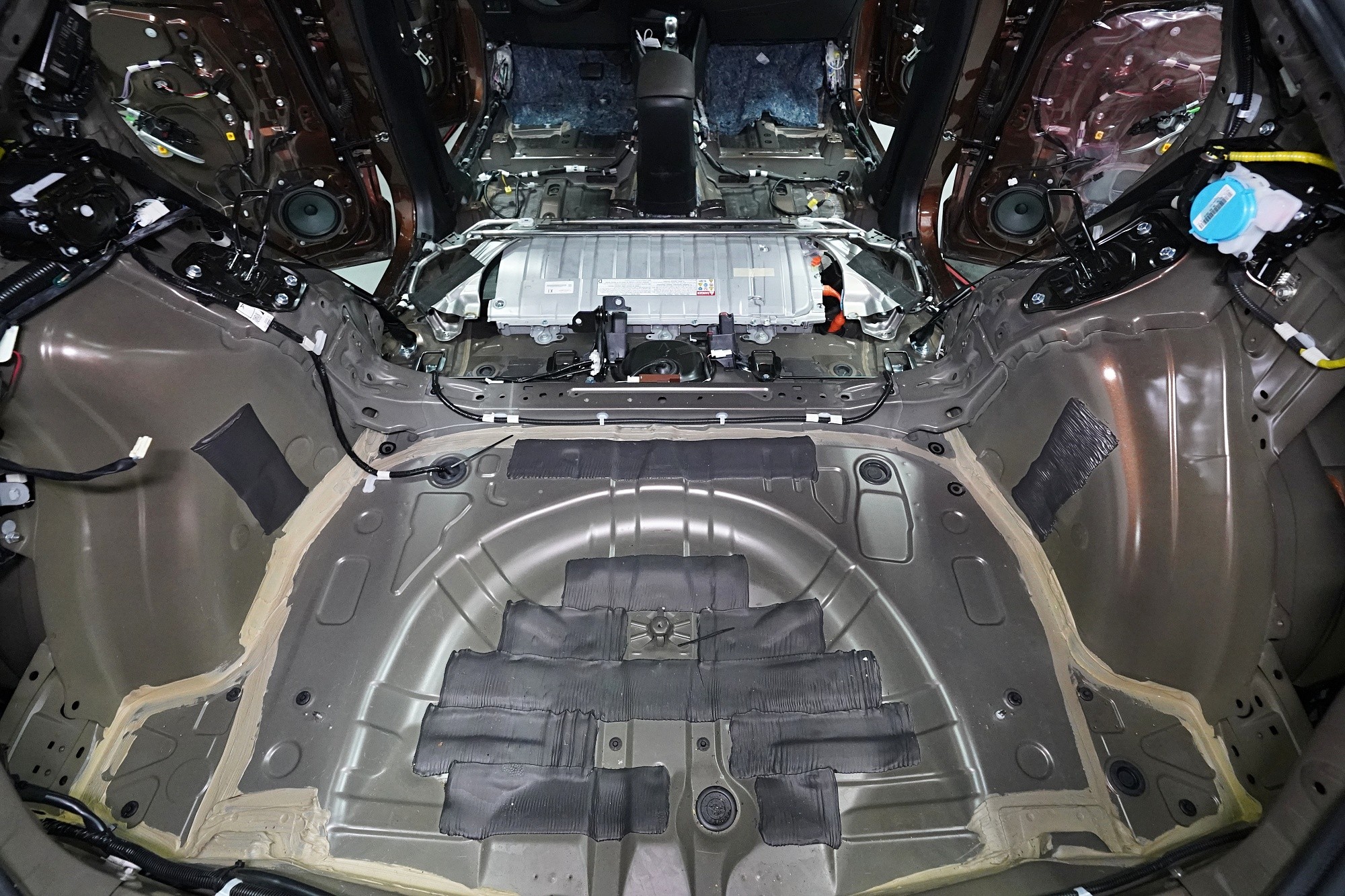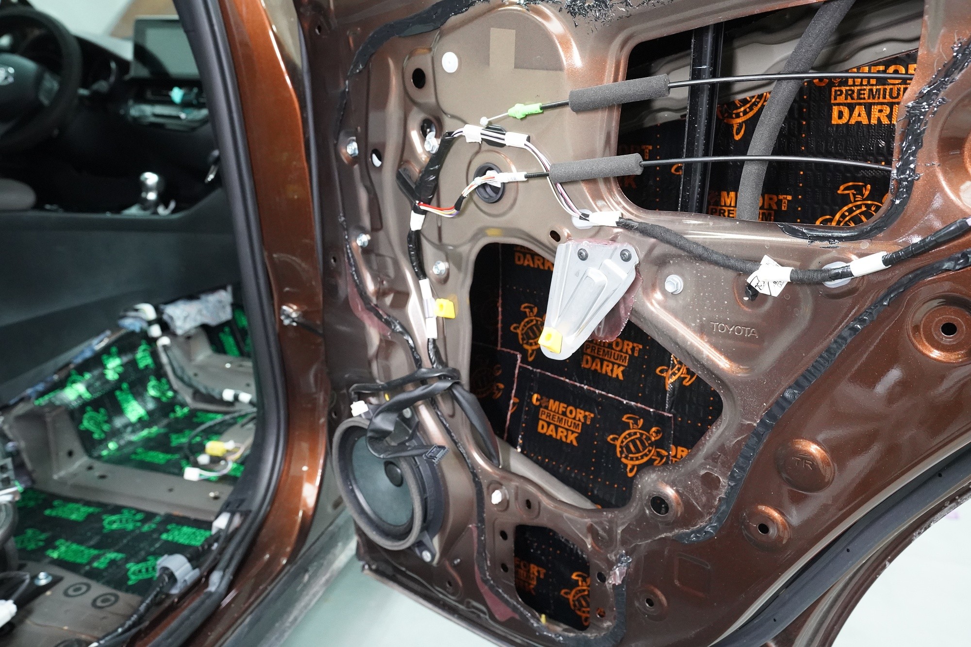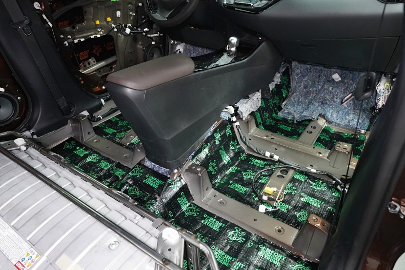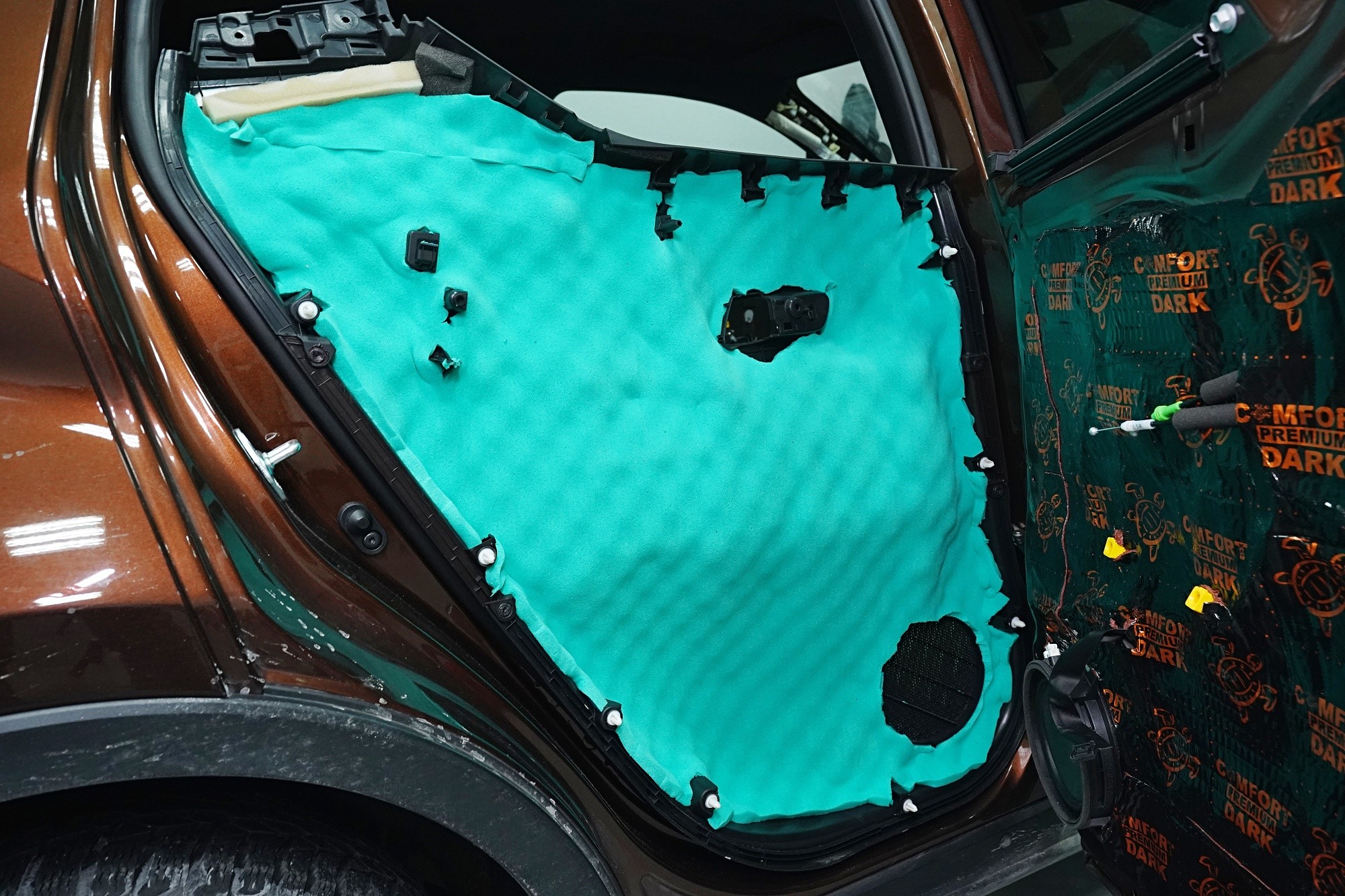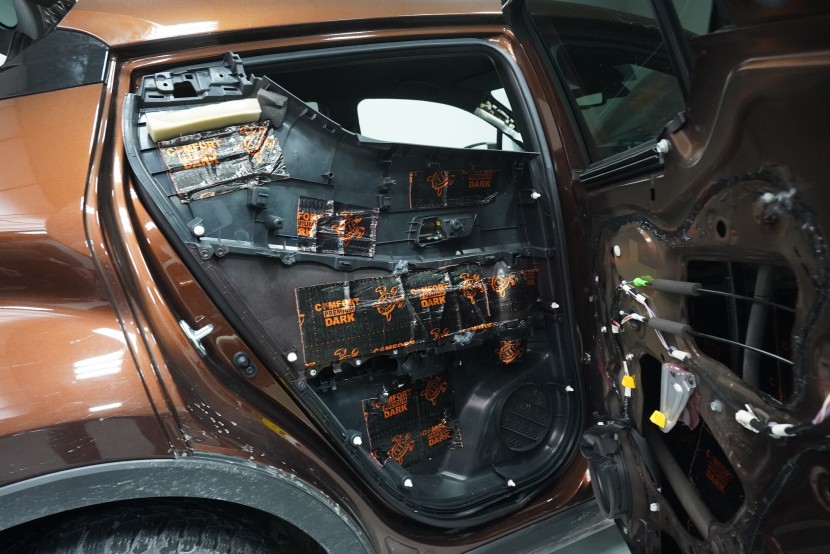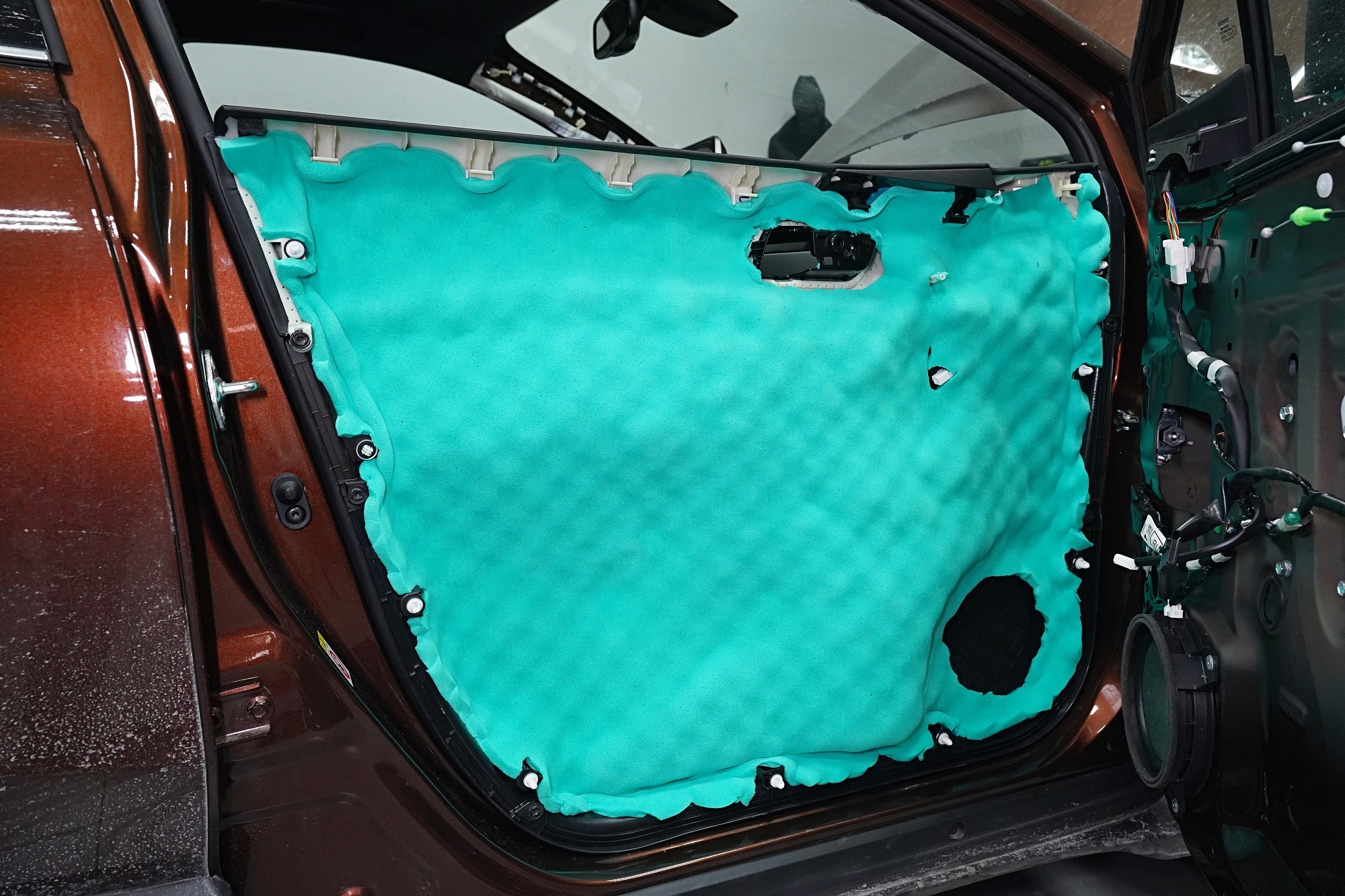 Toyota CHR Hybrid и нашата шумоизолация в рамките на най-ефективния пакет Expert Plus. Практически липсващата звукова изолация се проявява чрез силен шум от гумите, вода и камъчета в калниците, шум от вятъра при високи скорости, както и скърцане на пластмасите. Всичко това намалява комфорта при шофиране на този автомобил и затова собственикът се обърна към нас. След нашата шумоизолация изчезват вибрациите от двигателя, трансмисията или окачването, както и въздушно-преносимият шум на различни честоти от областта на пода, предните и задните калници и разбира се от вратите и задната част на автомобила. Съвместно със собственика се договорихме за нашия най-ефективен пакет шумоизолация Expert Plus. В сравнение с класическия пакет Expert избираме по-ефективни и по-дебели материали и повече слоеве с фокус най-вече върху пода и задните калници на автомобила. Конкретно шумоизолираме предните, задните и петите врати, пода, багажното пространство, покрива, предните и задните калници от вътрешната страна, таблото и капака на двигателя. Всички важни области на автомобила са шумоизолирани с модерни двуслойни материали и в резултат са приложени четири слоя шумоизолация с различни свойства. За шумоизолацията едновременно работят четирима наши техници, които извършват монтажа в рамките на 1 работен ден.
